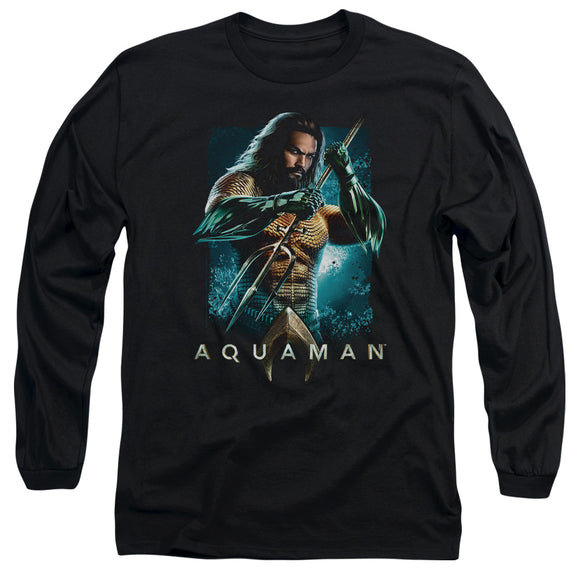 - An Aquaman Movie Long Sleeve featuring Jason Momoa posing with his weapon, the trident
