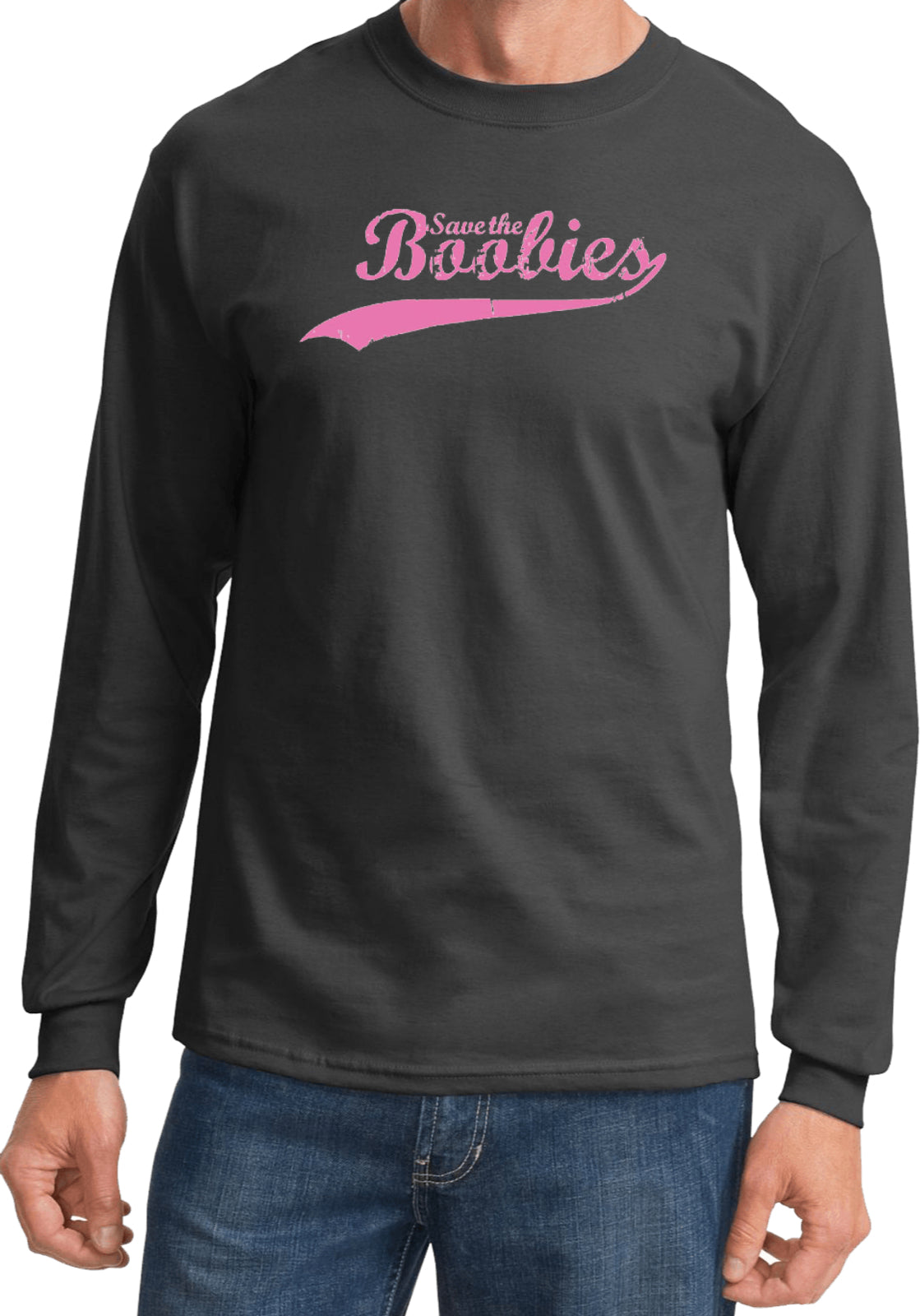 • A breast cancer awareness long sleeve shirt that reads Save the Boobies