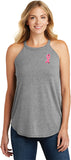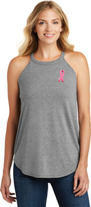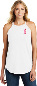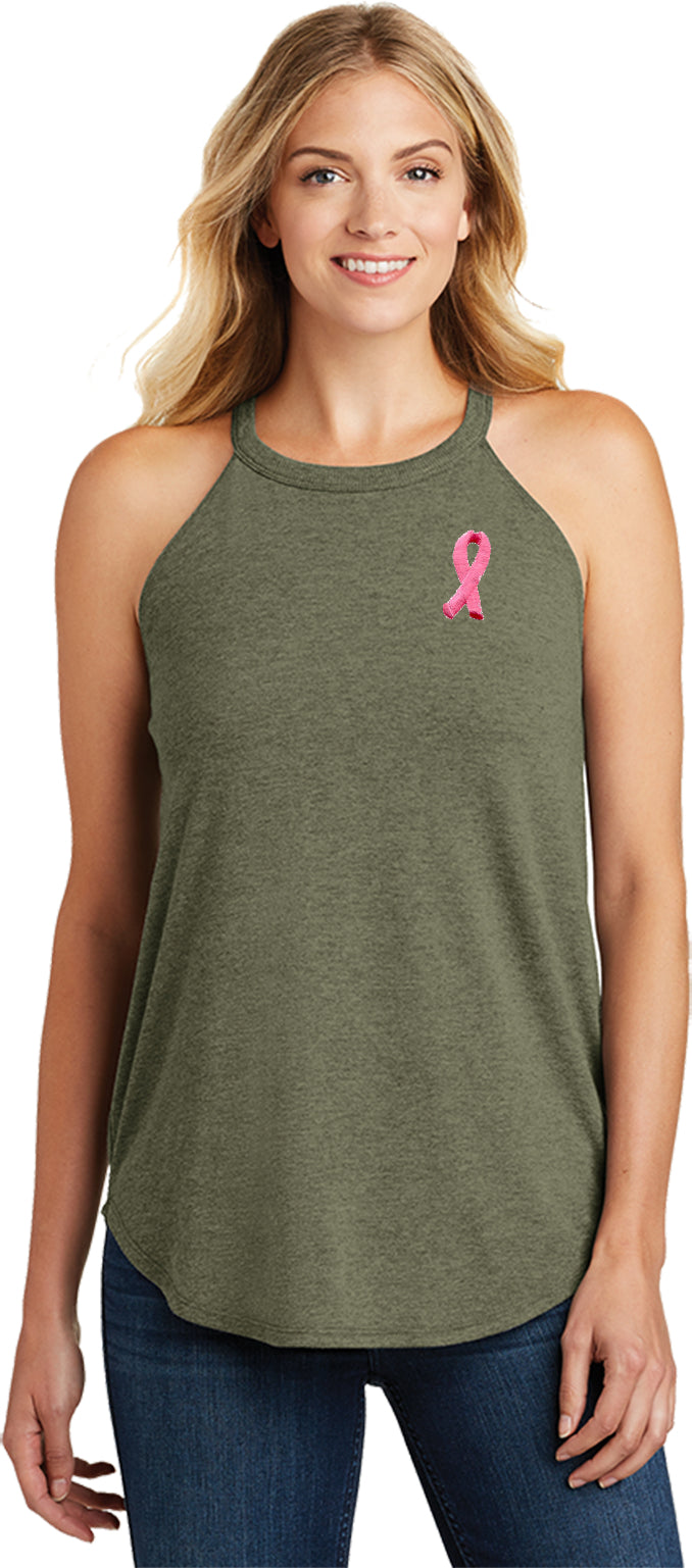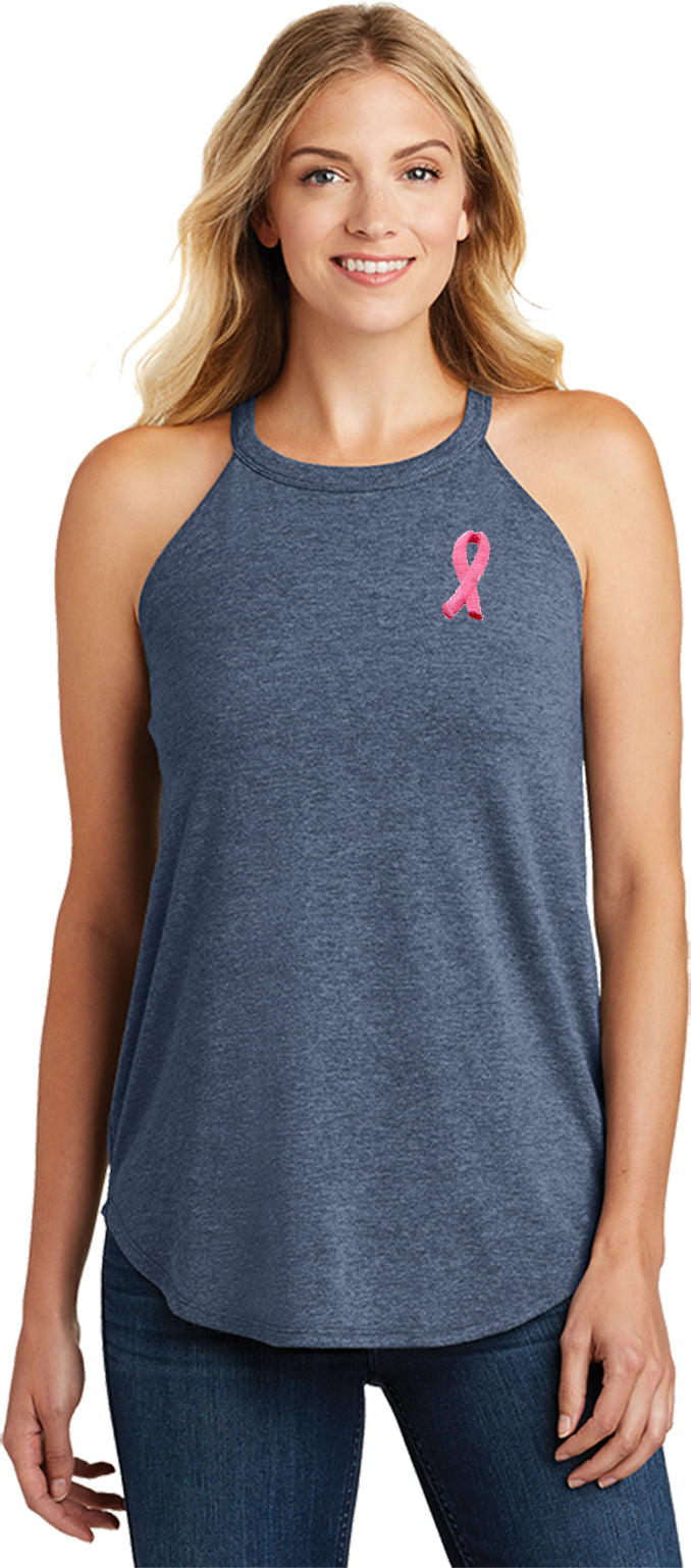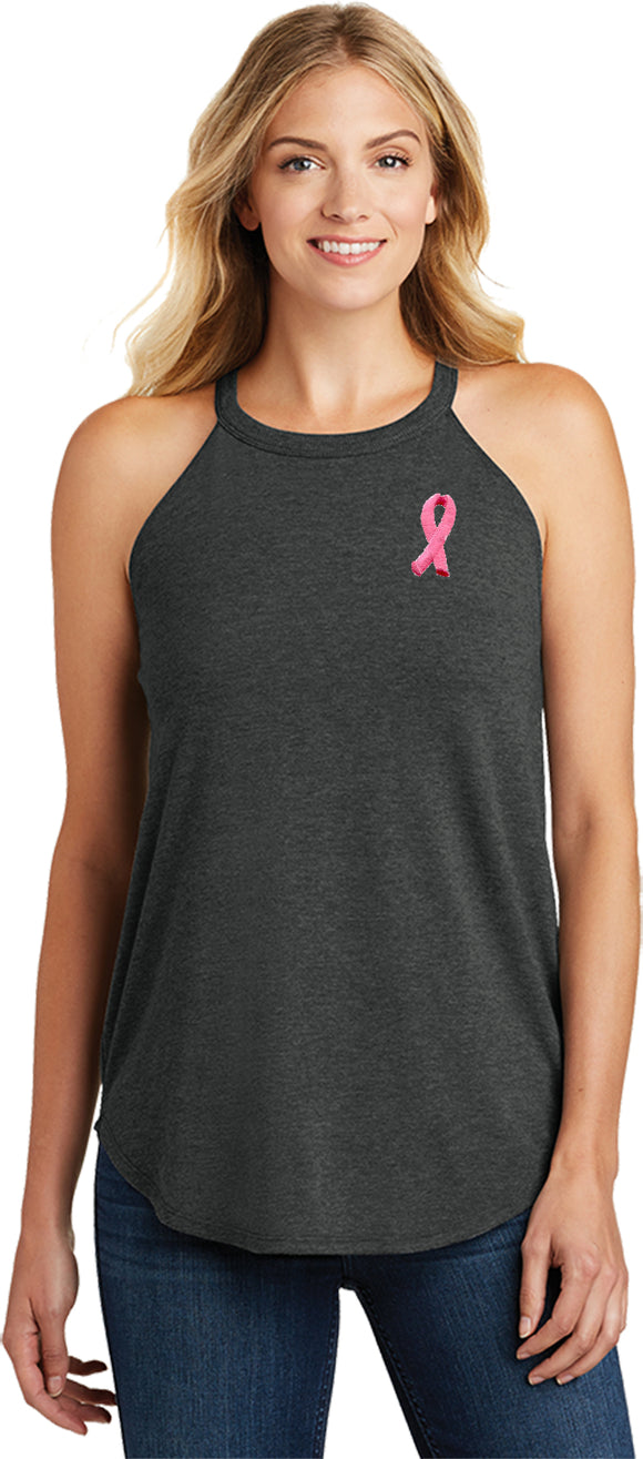 - A cute ladies tank top featuring an embroidered Breast Cancer Ribbon as a pocket print