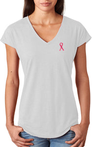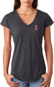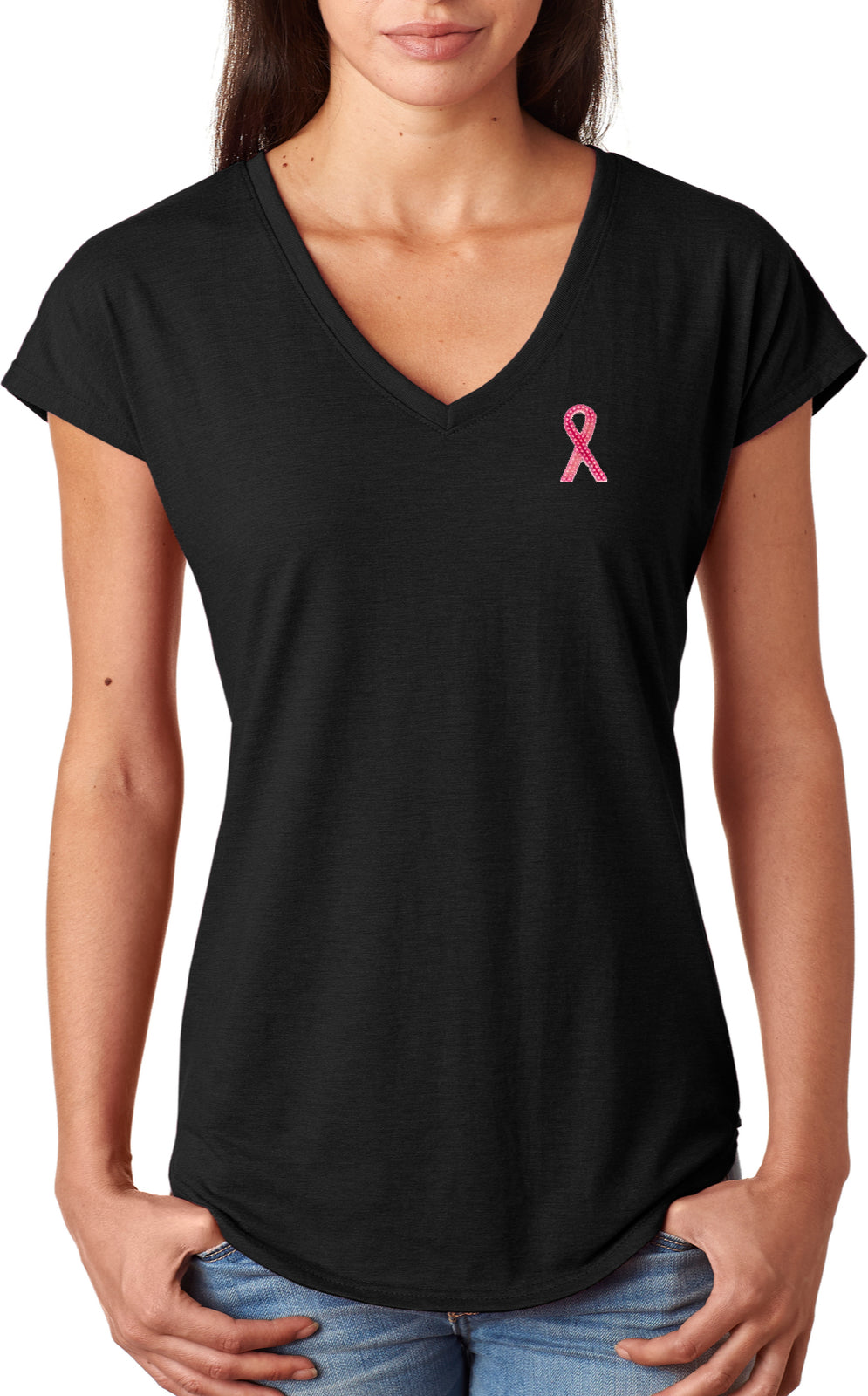 - A ladies tri blend v-neck featuring a pink breast cancer awareness ribbon with sequins