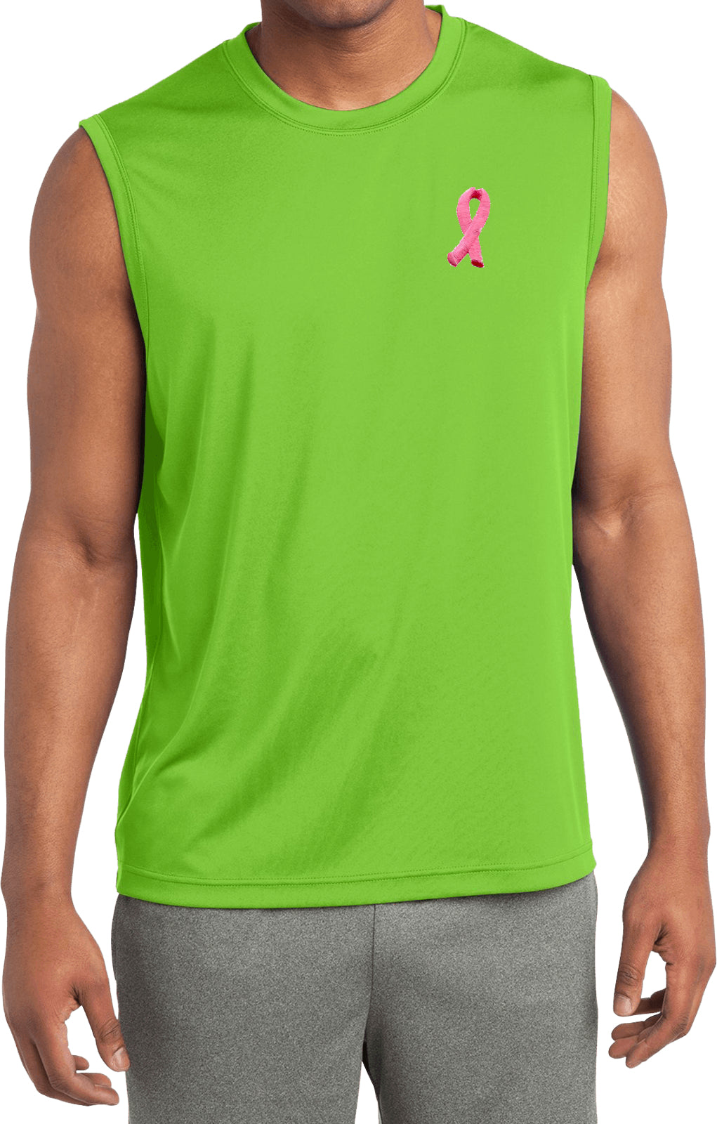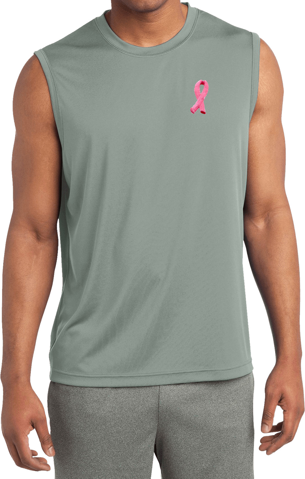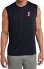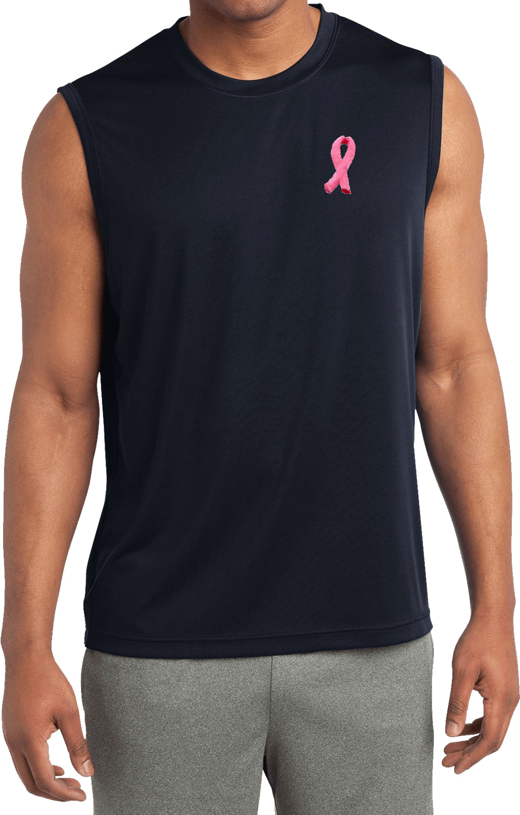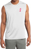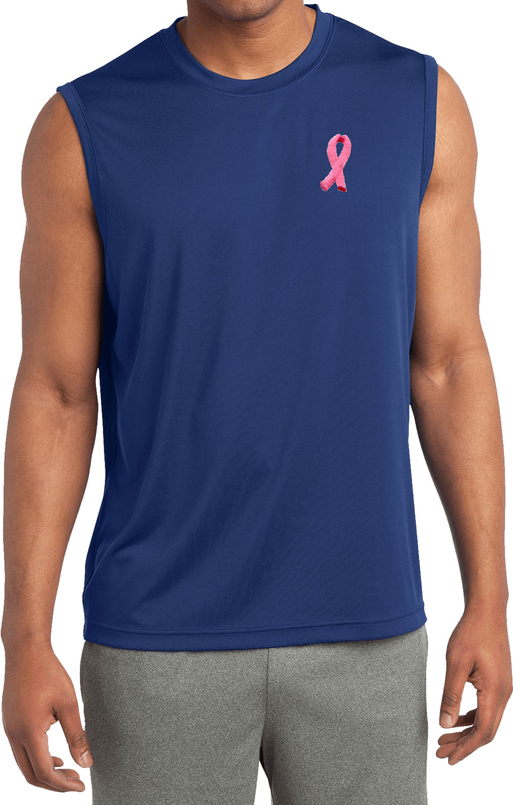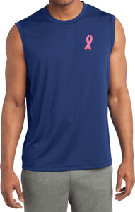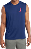 - A mens dry wicking sleeveless shirt featuring an embroidered Breast Cancer Ribbon as a pocket print