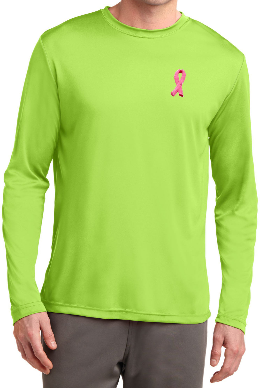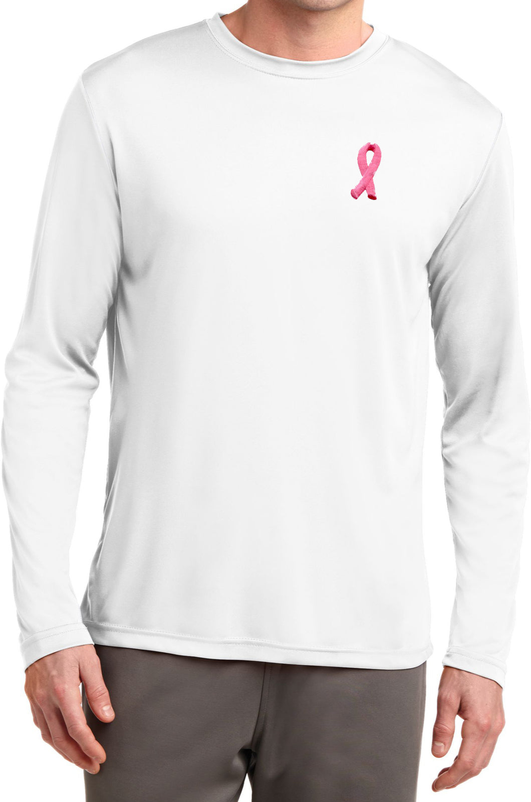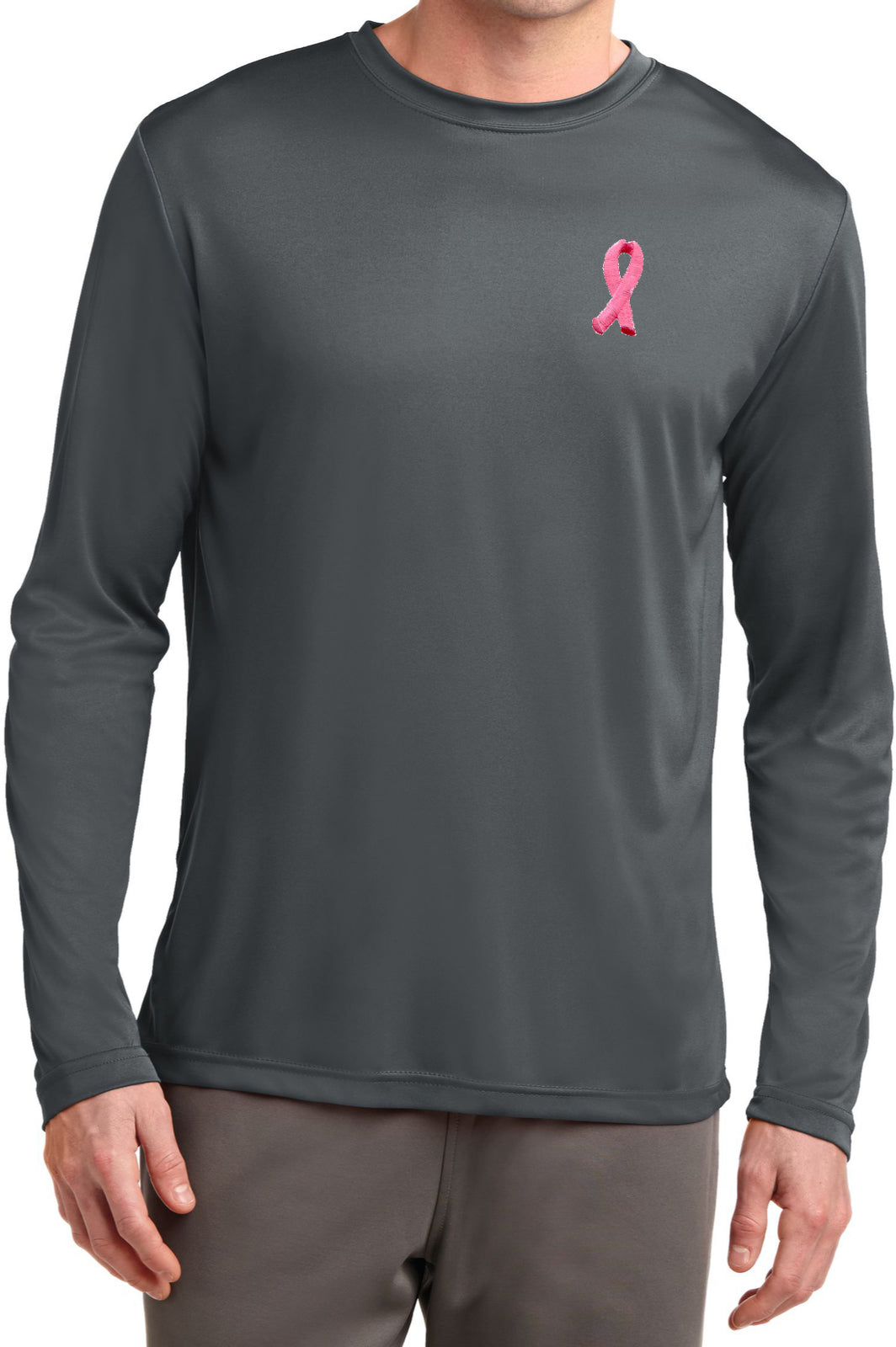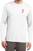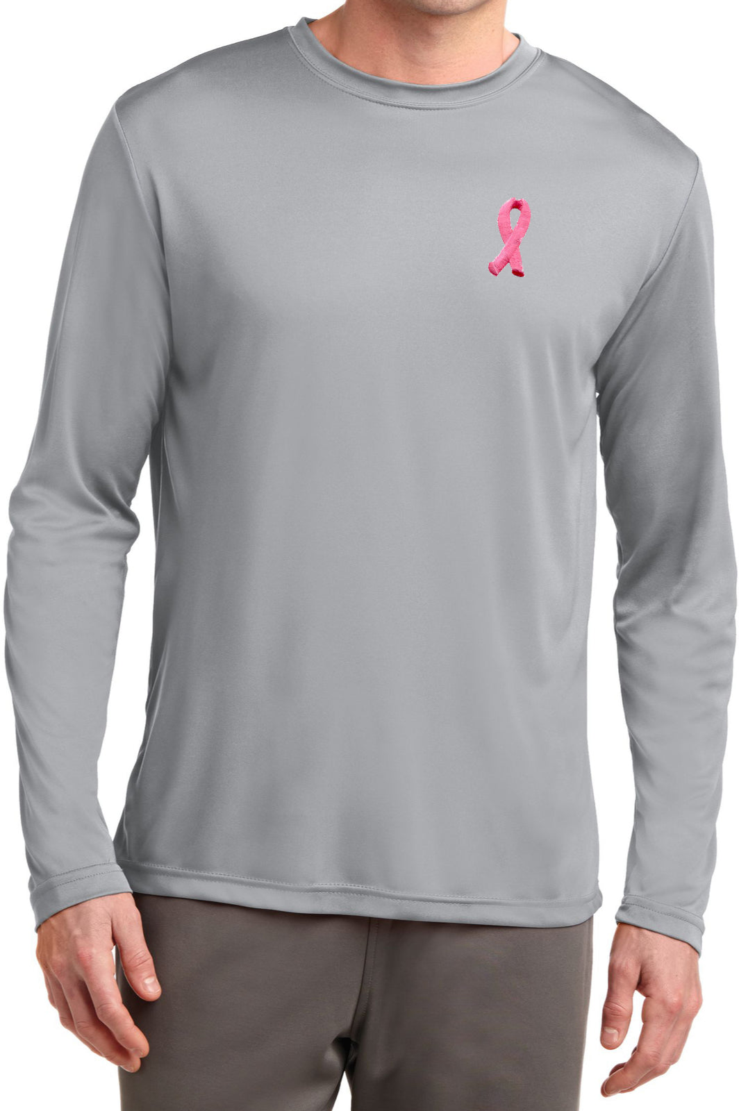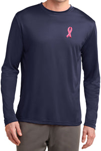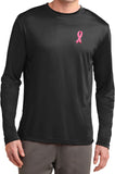 - A mens dry wicking long sleeve shirt featuring an embroidered Breast Cancer Ribbon as a pocket print