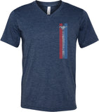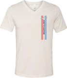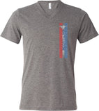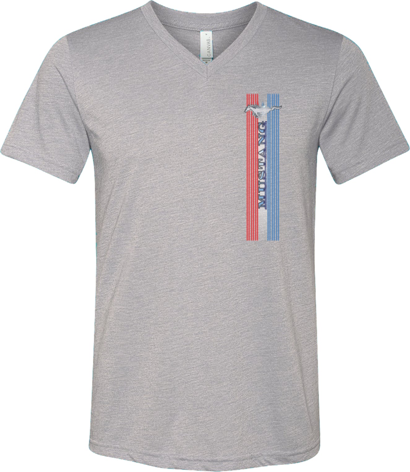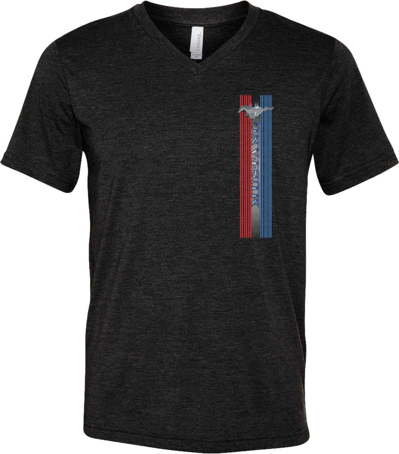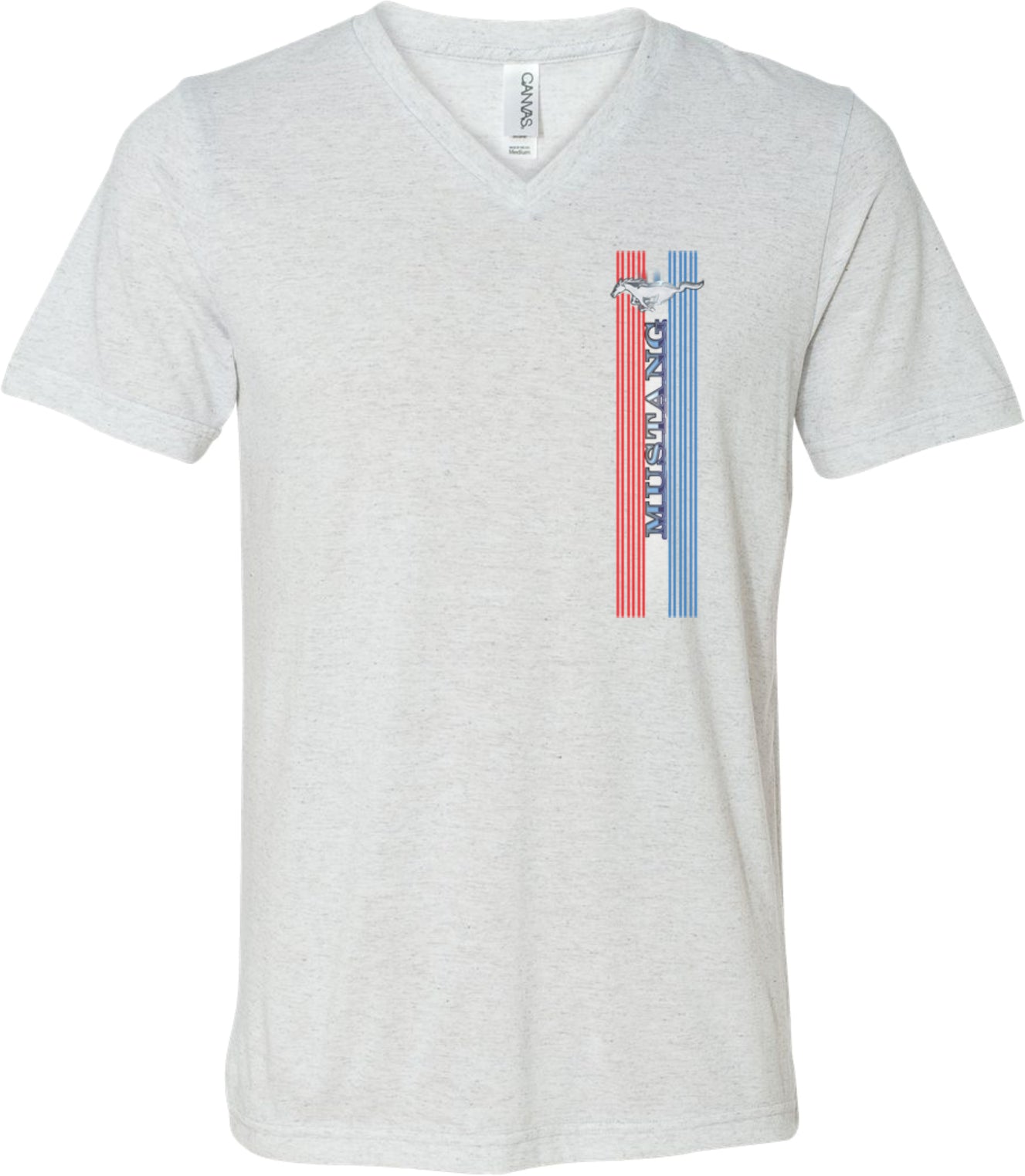 - A mens tri blend v-neck featuring a Ford Mustang Pony logo