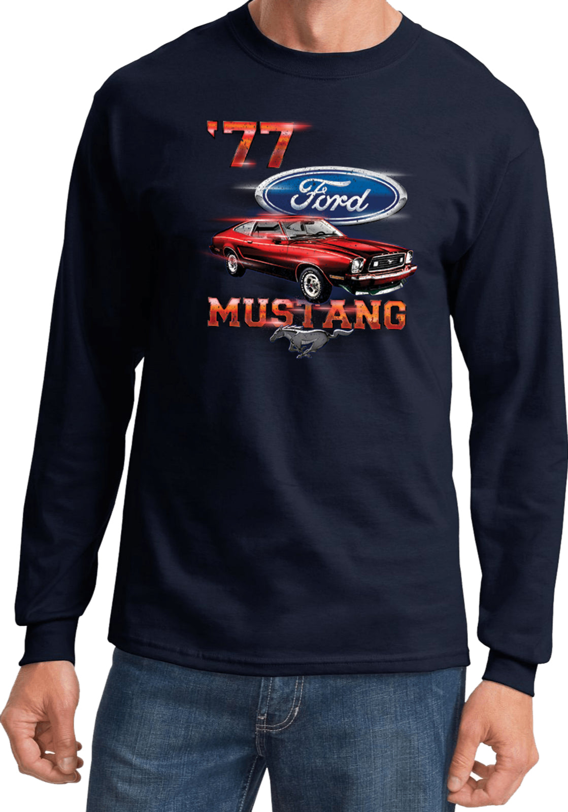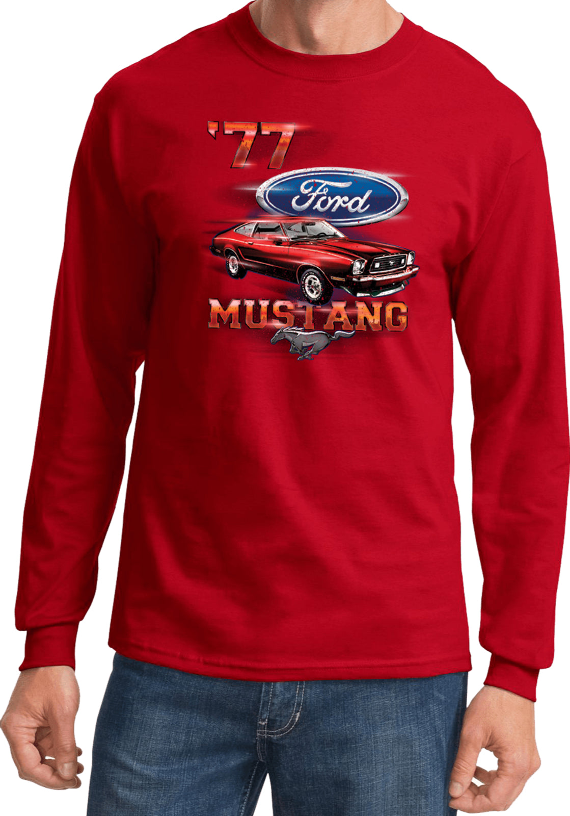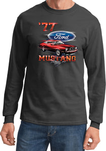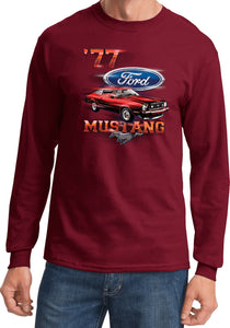 - A red 1977 Ford Mustang long sleeve shirt