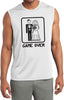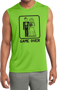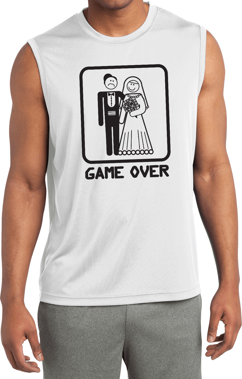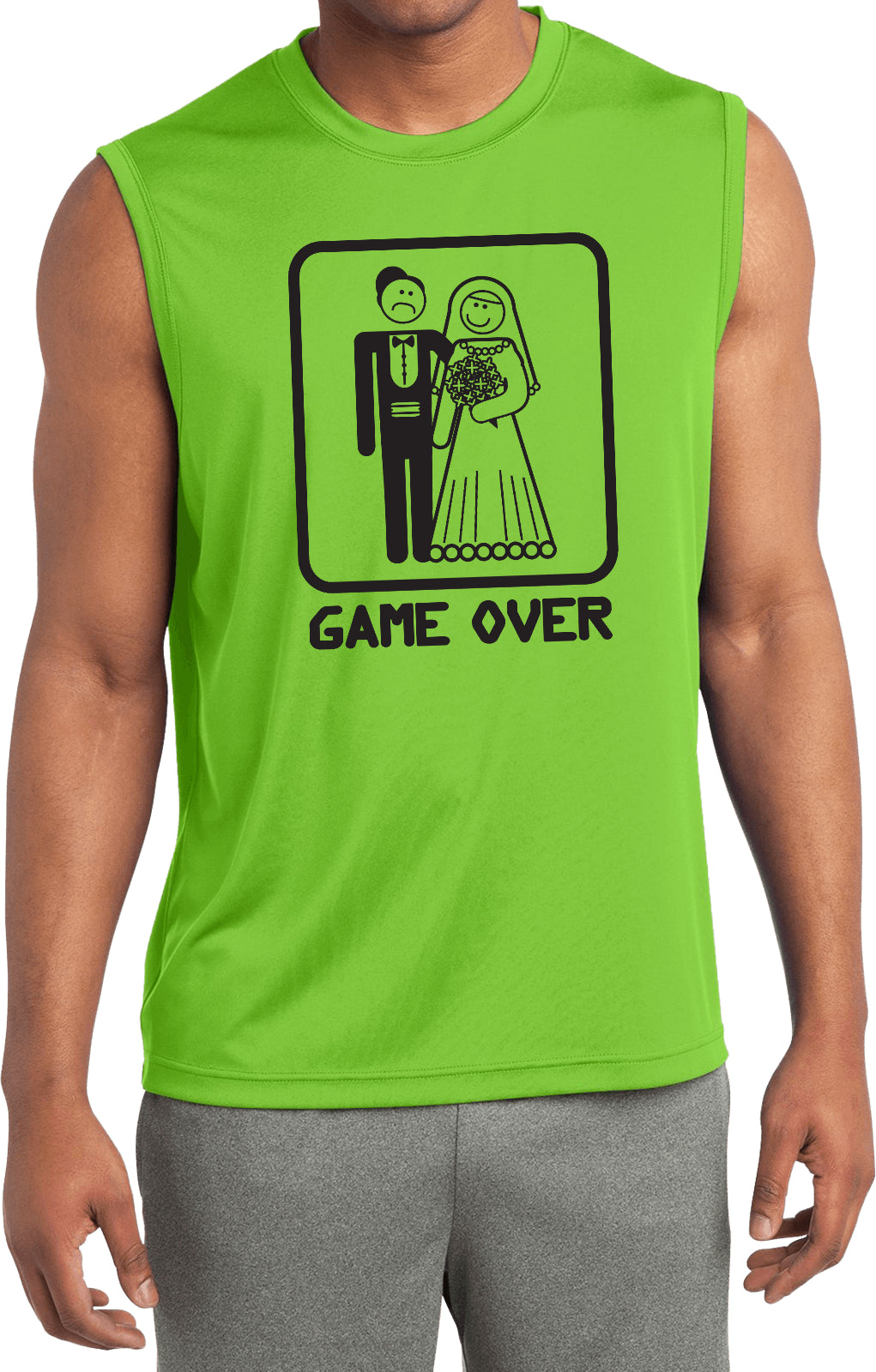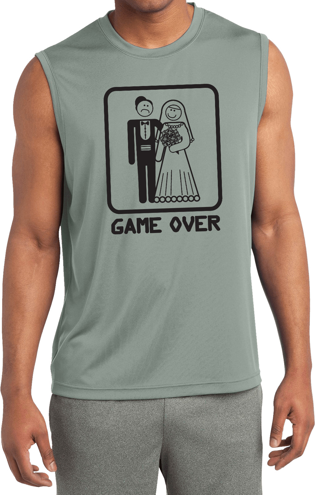 A funny Game Over mens moisture wicking muscle shirt made of 100% polyester.