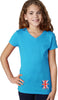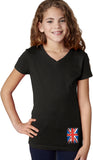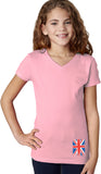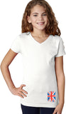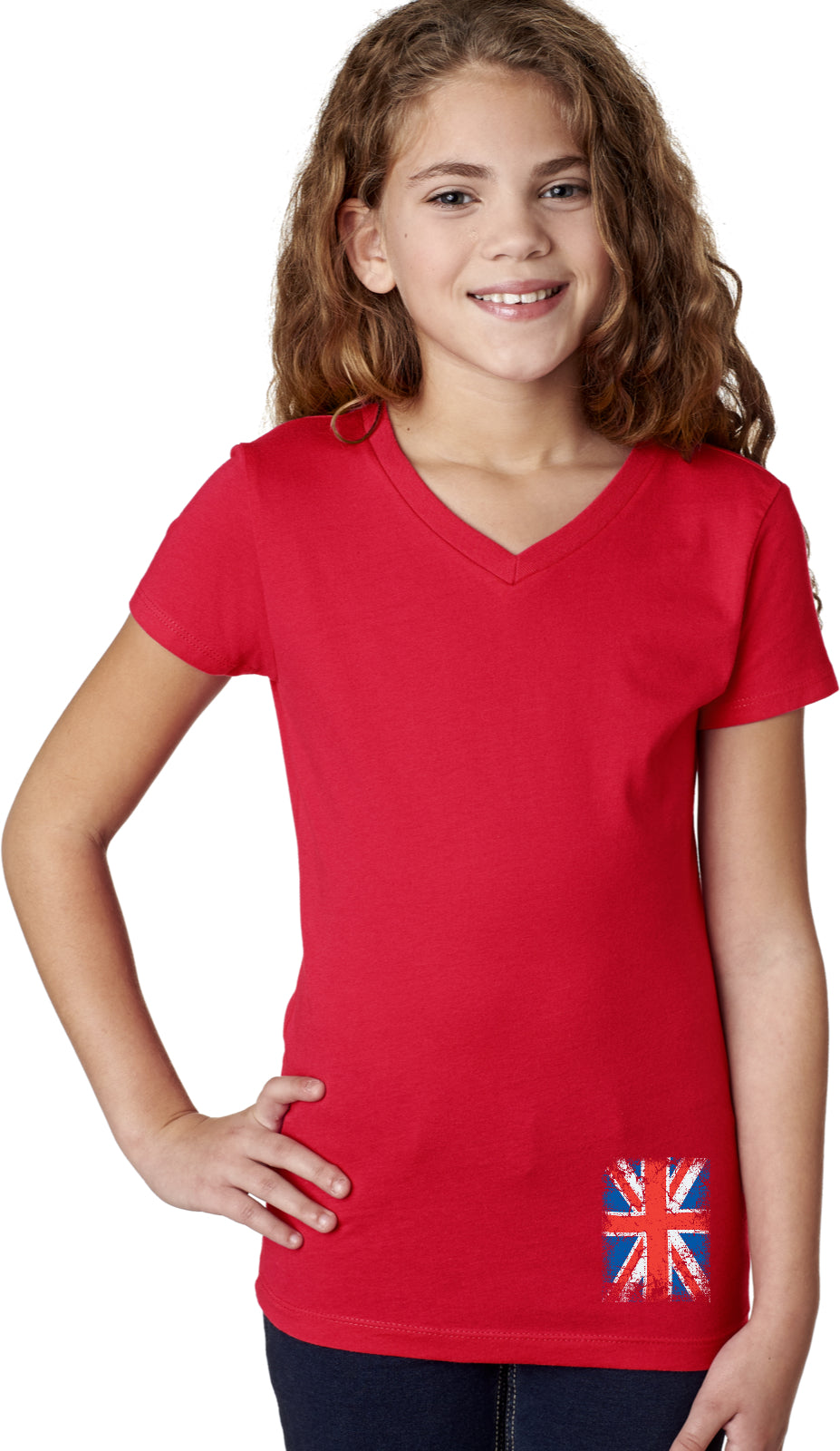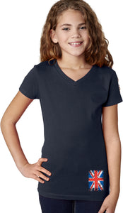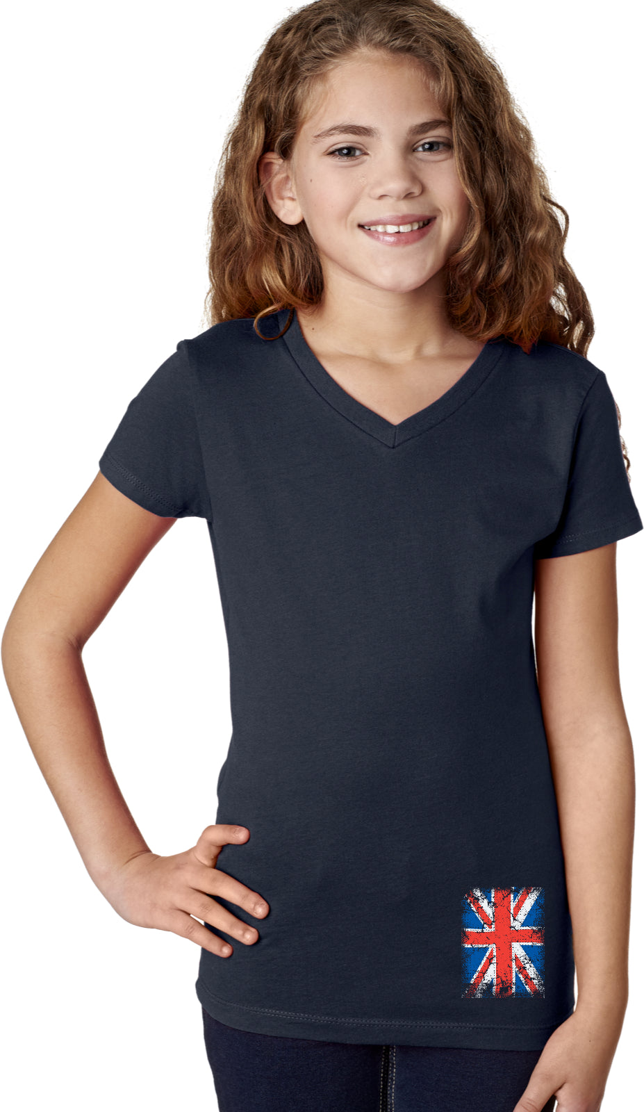 - A girls v-neck shirt featuring a Union Jack Flag at the bottom