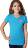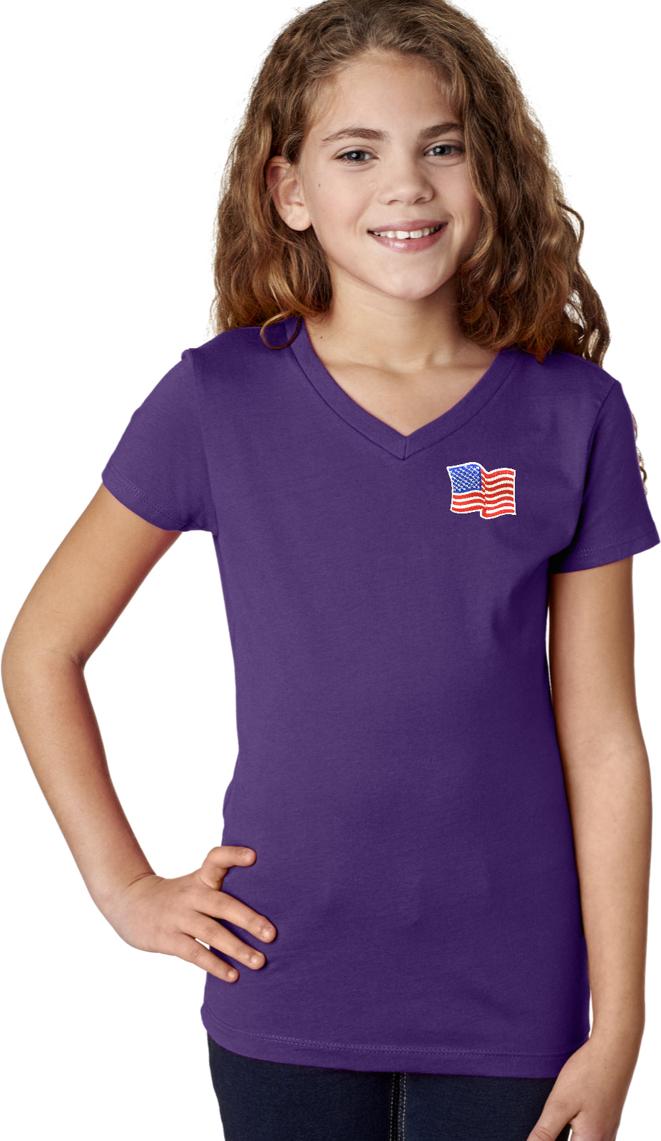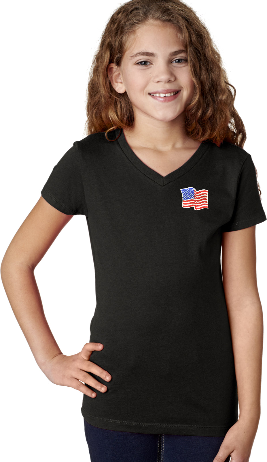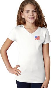- A girls v-neck shirt featuring the American Flag as a pocket print