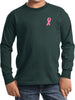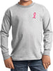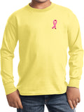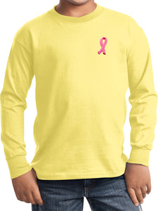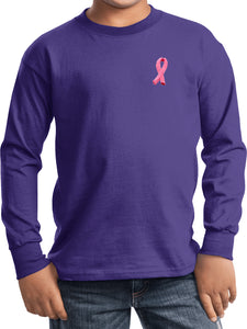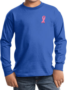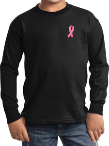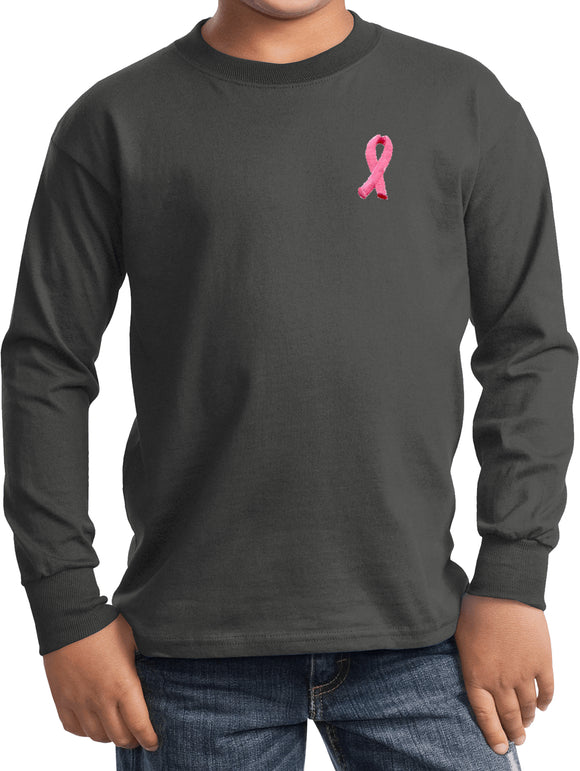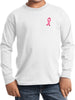 - A youth long sleeve shirt featuring an embroidered Breast Cancer Ribbon as a pocket print