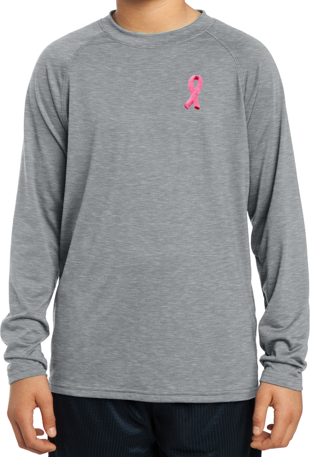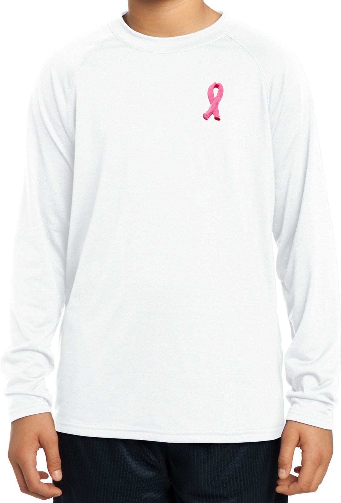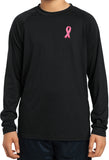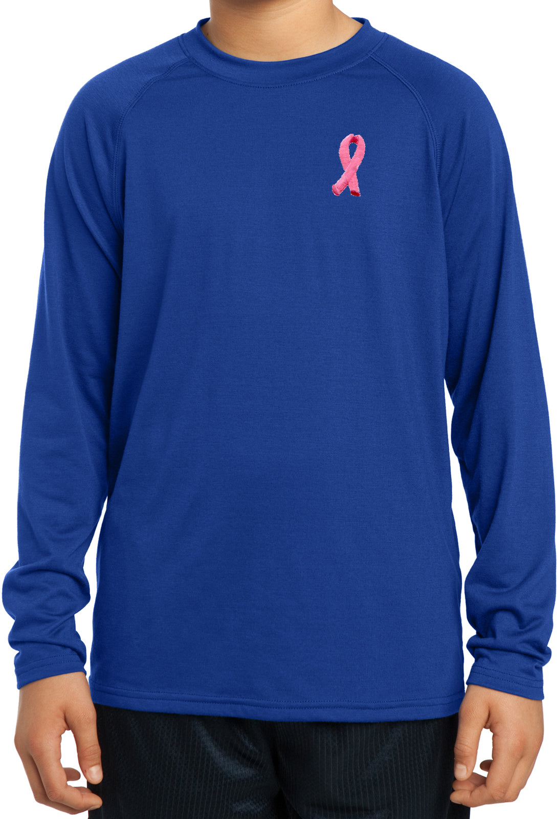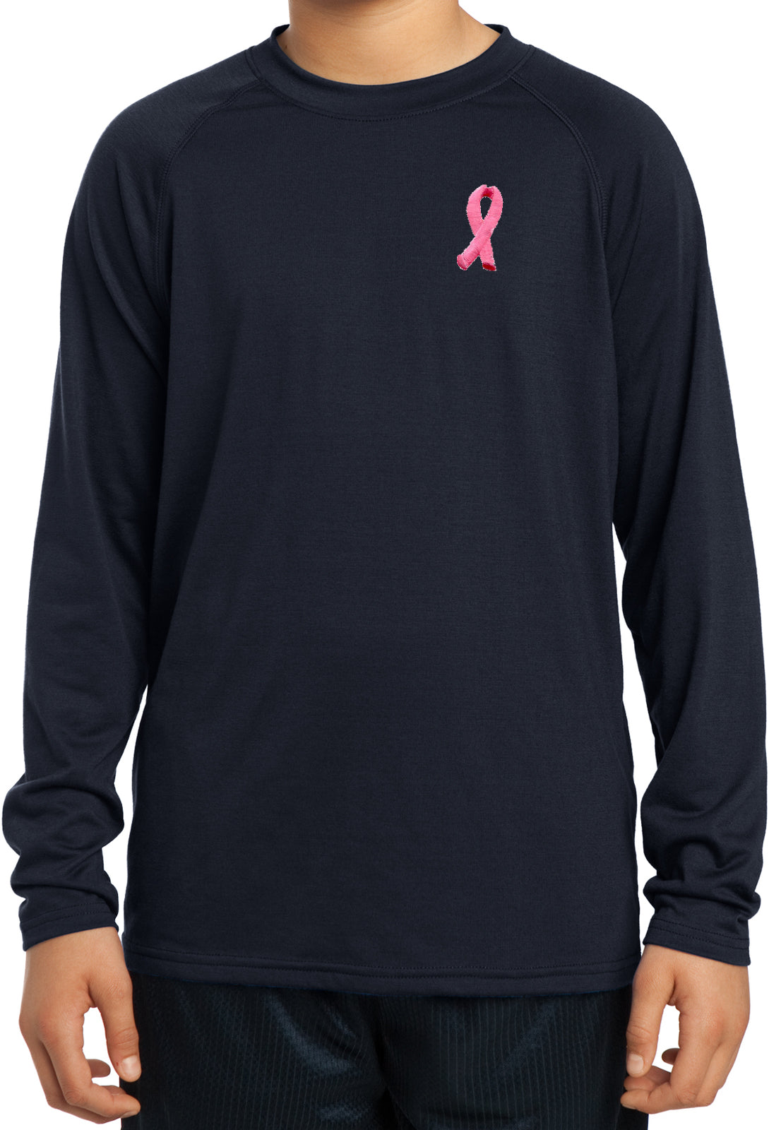 - A youth dry wicking long sleeve shirt featuring an embroidered Breast Cancer Ribbon as a pocket print