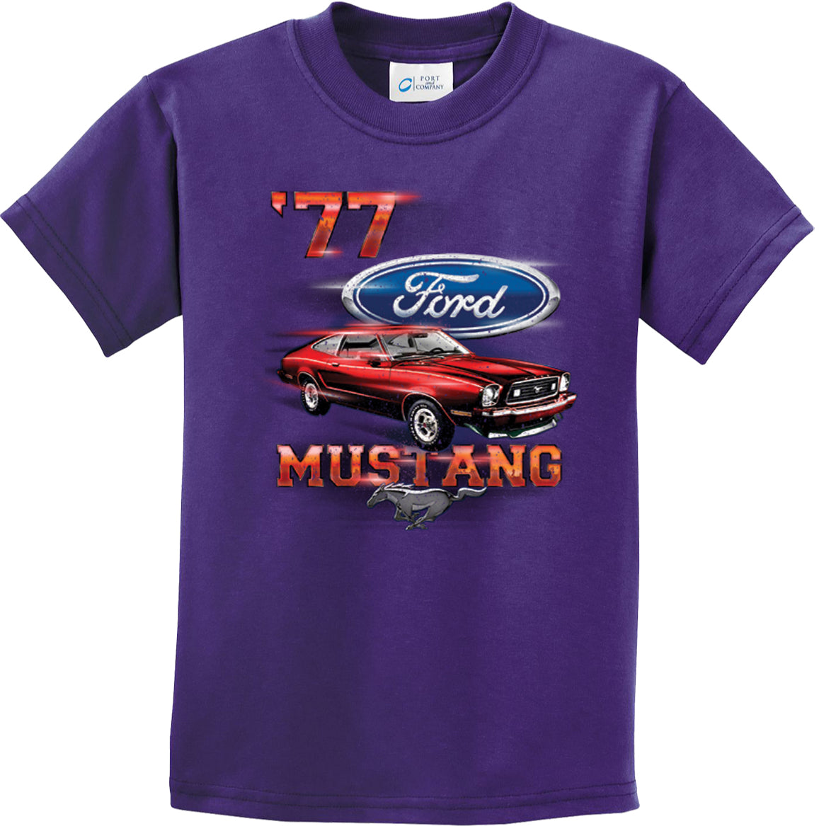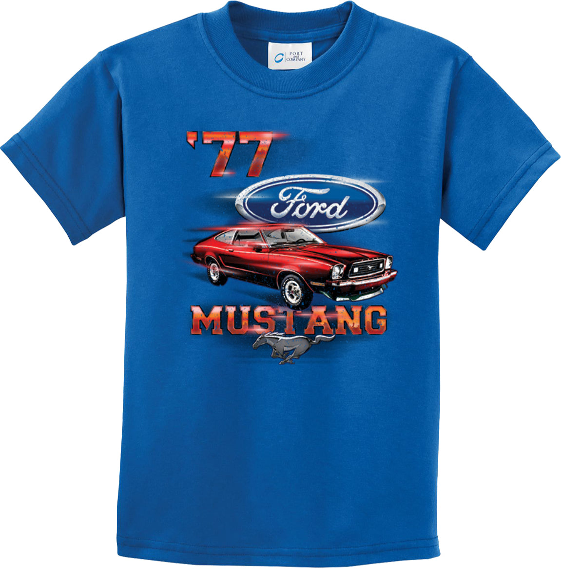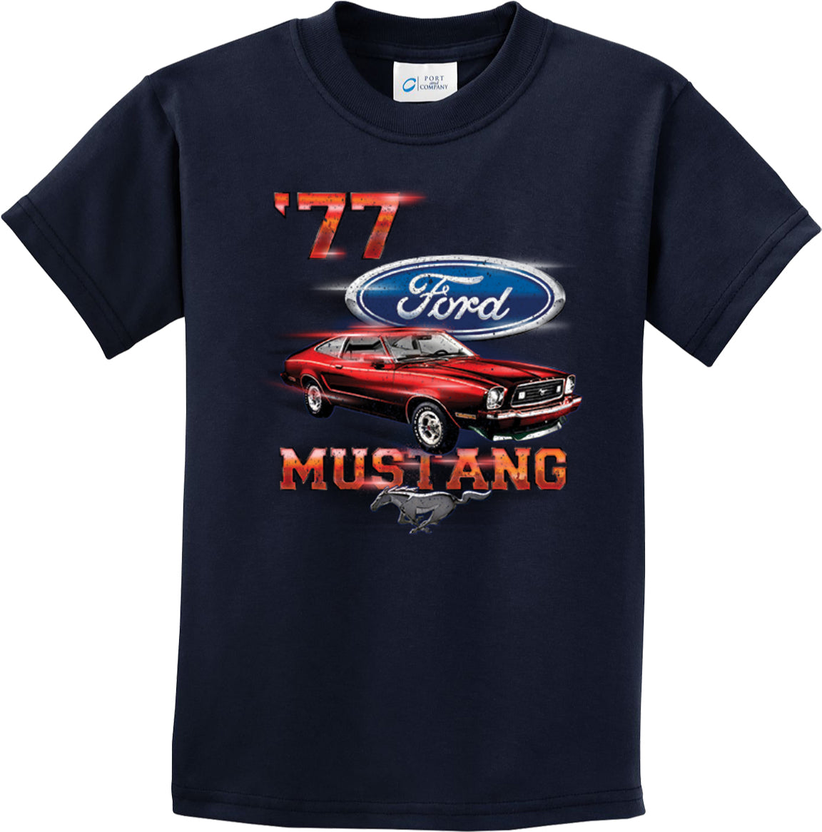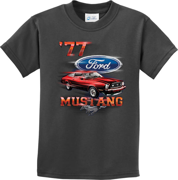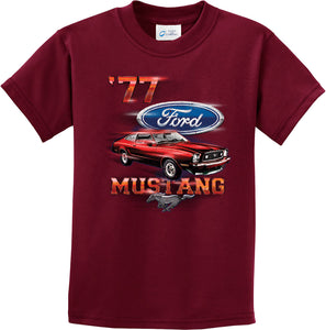 - A red 1977 Ford Mustang kids t-shirt