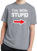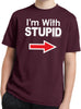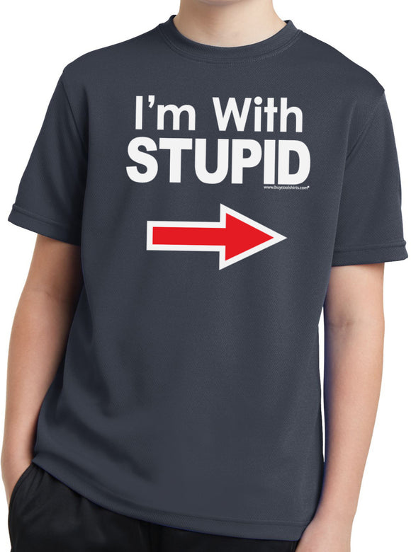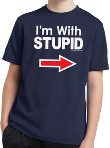 - A youth dry wicking t-shirt featuring I'm With Stupid