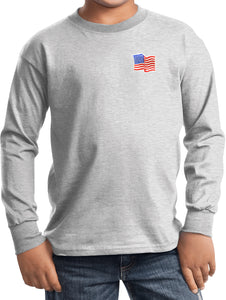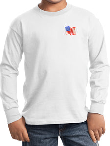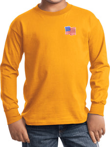 - A kids long sleeve shirt featuring the American Flag as a pocket print