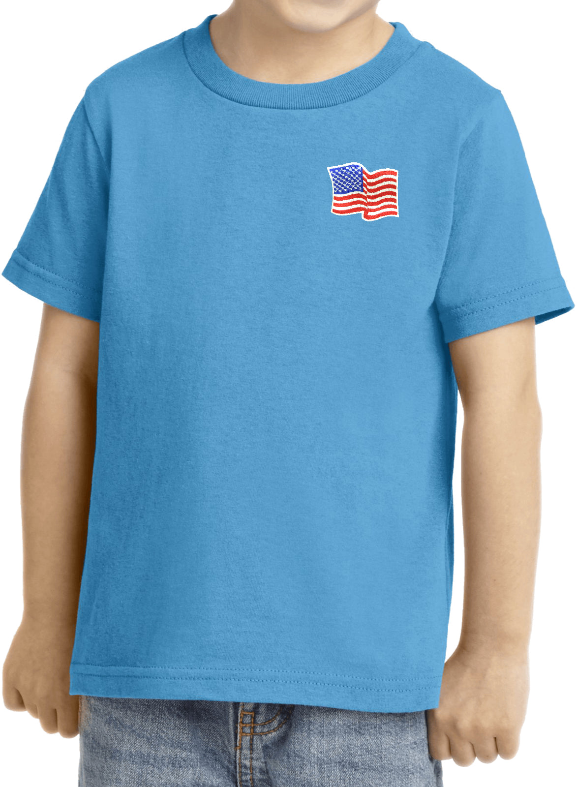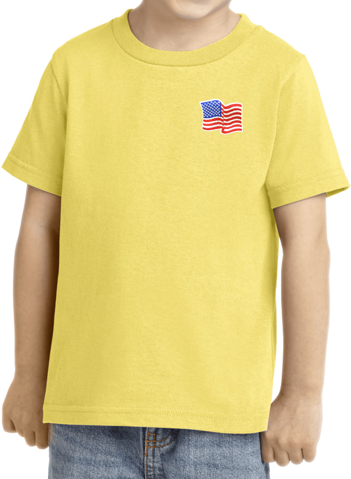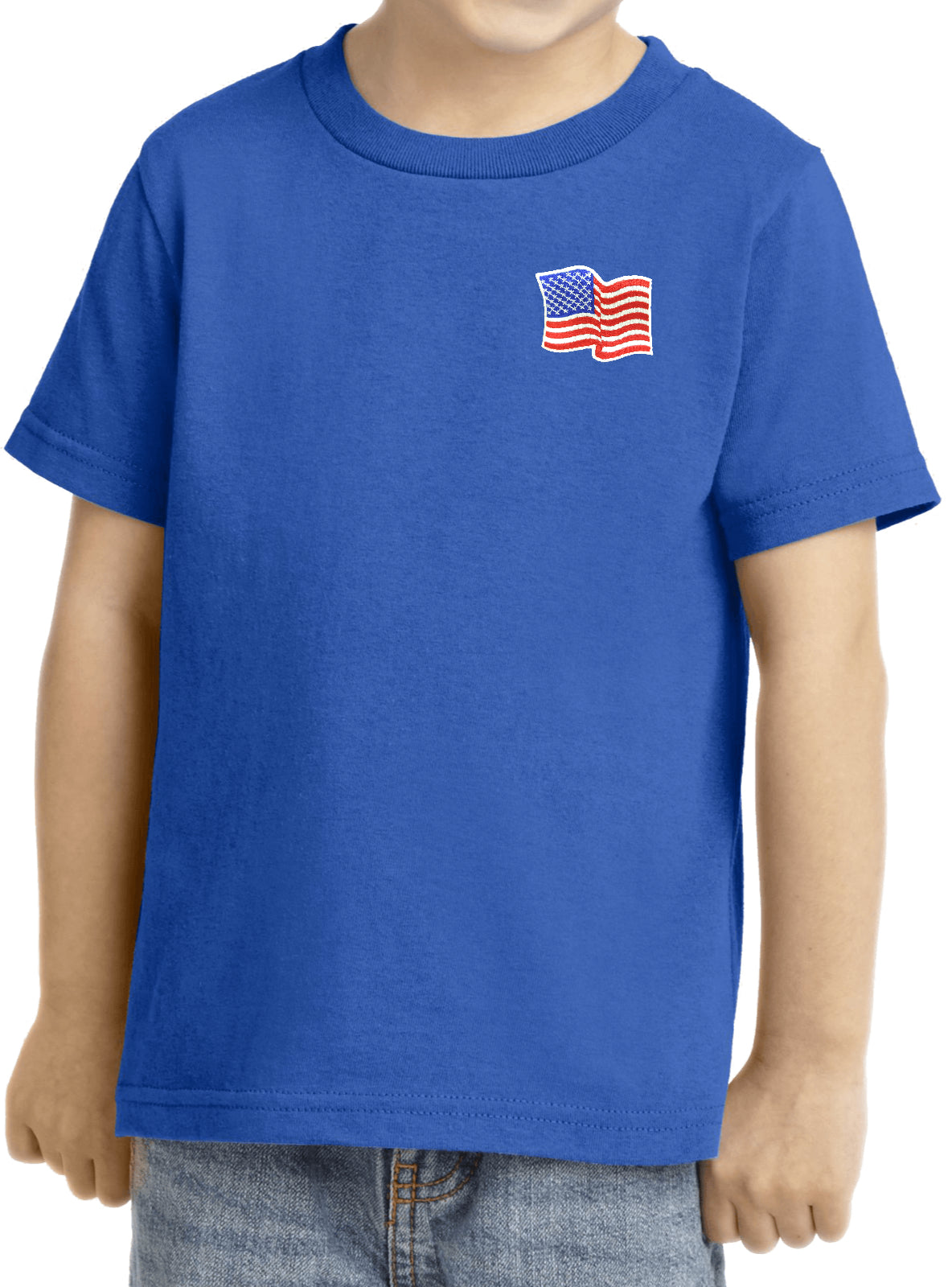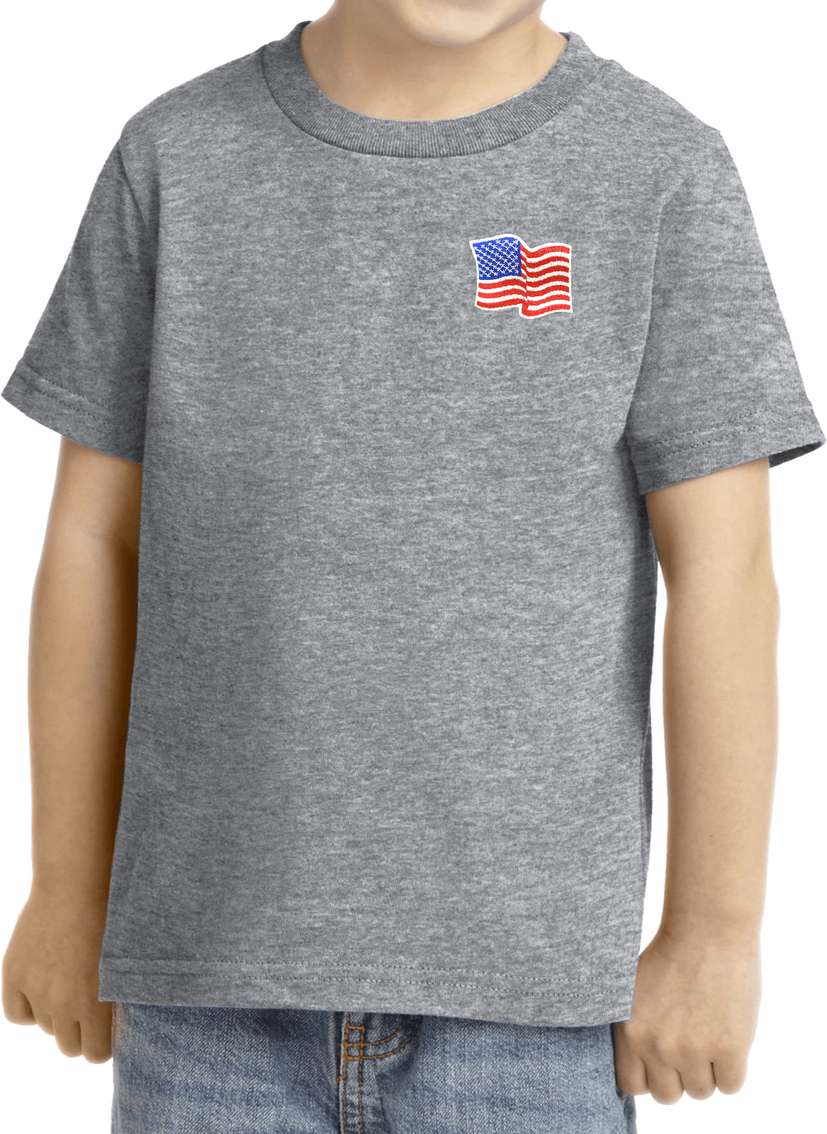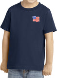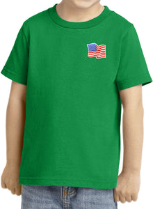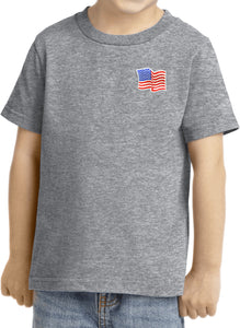- A toddler t-shirt featuring the American Flag as a pocket print