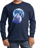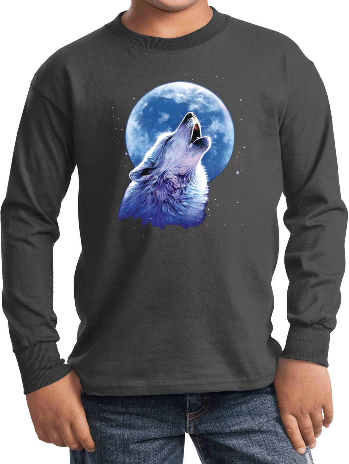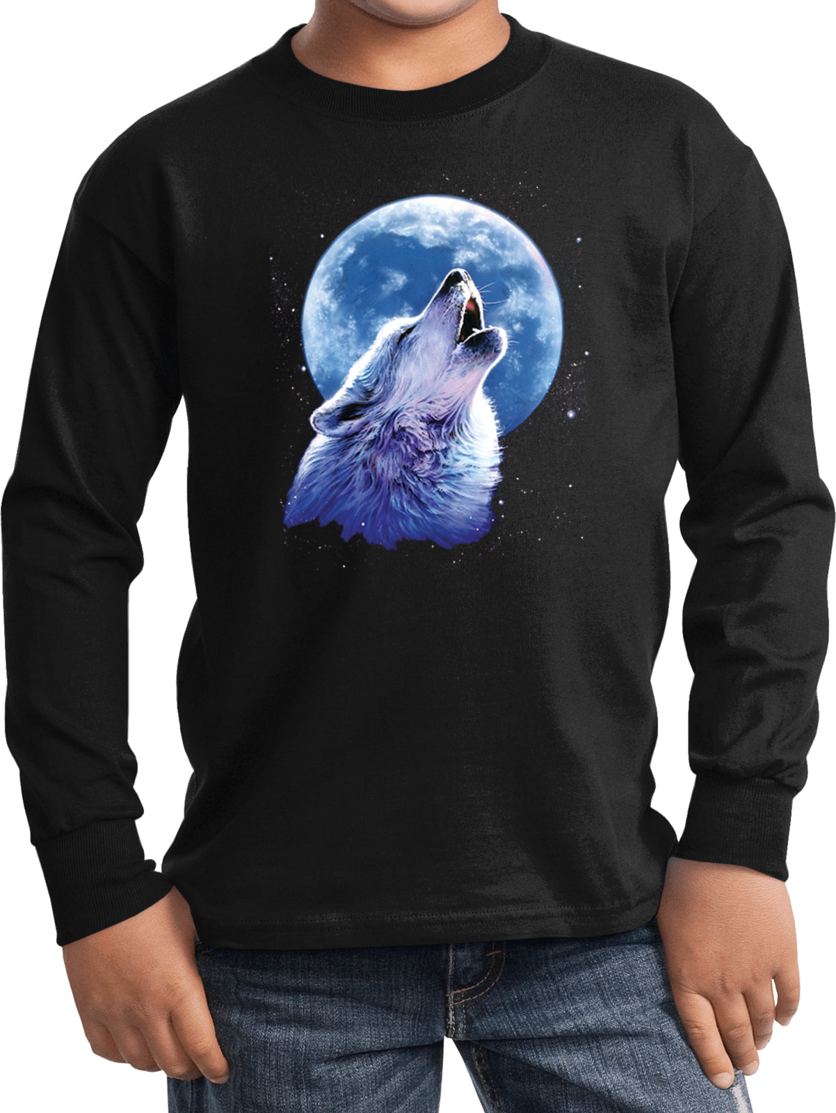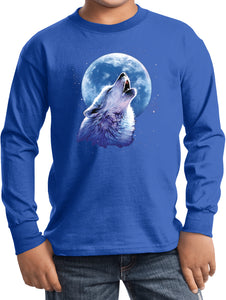 - A kids long sleeve shirt featuring a wolf howling at the moon