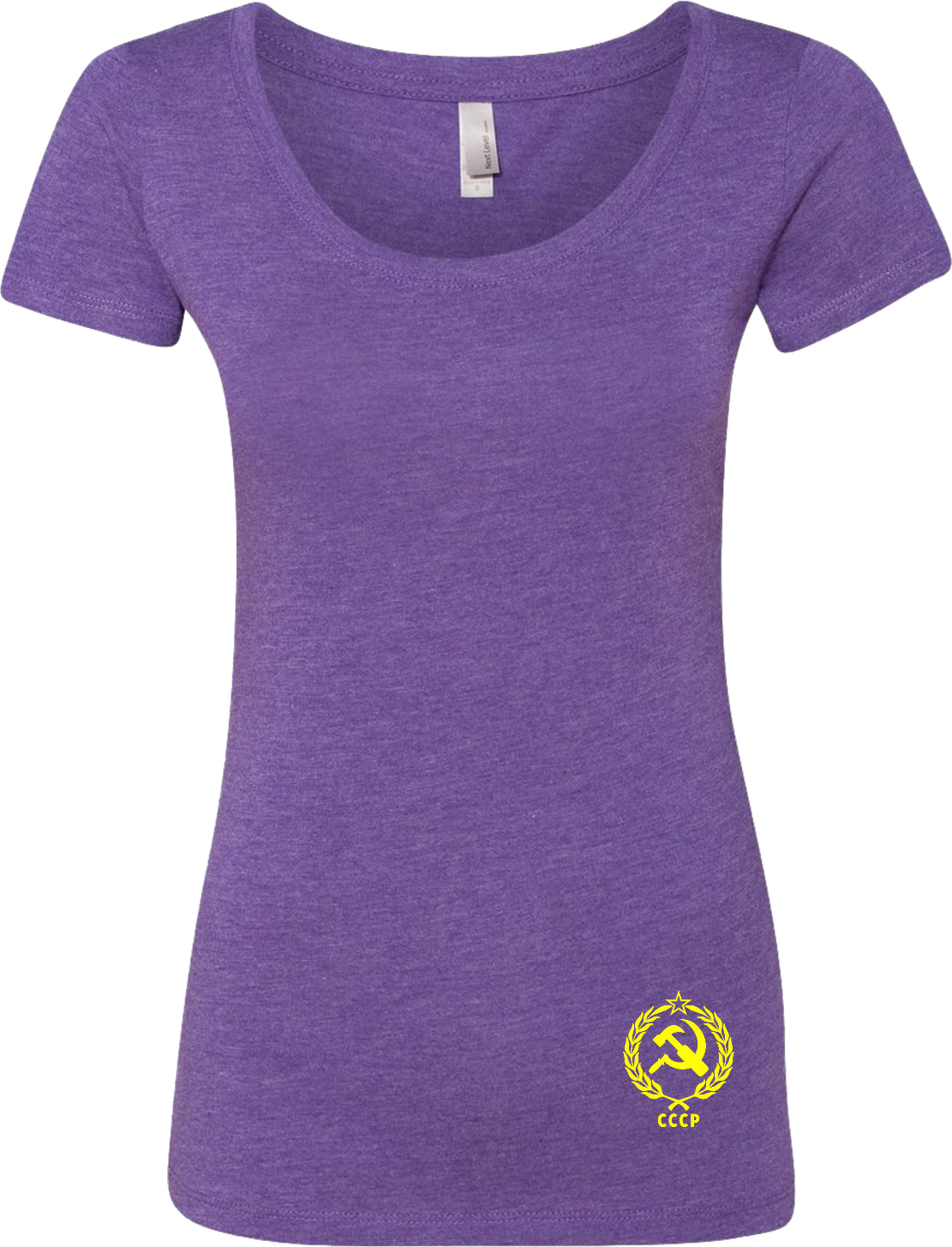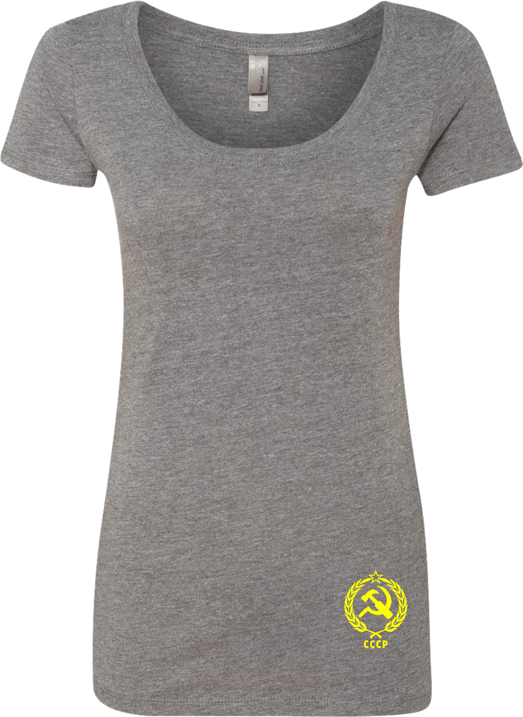 - A ladies scoop neck shirt featuring CCCP Hammer and Sickle at the bottom