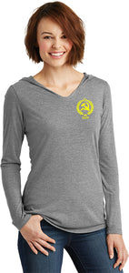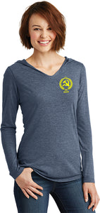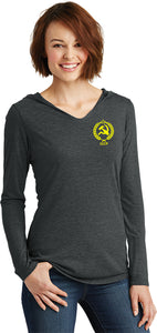 - A ladies lightweight hoodie with a raw edge v-neck featuring CCCP Hammer and Sickle