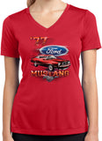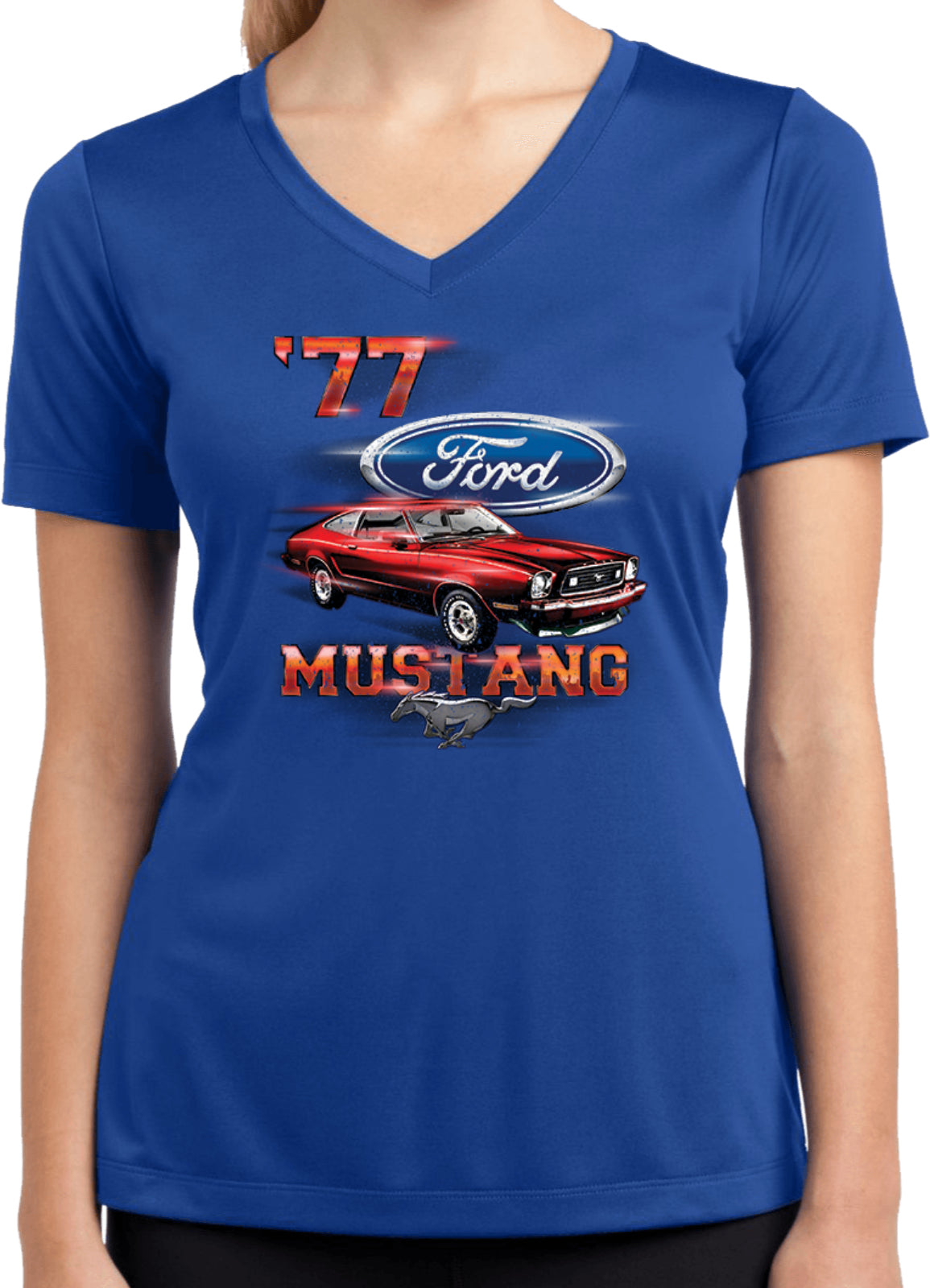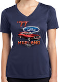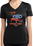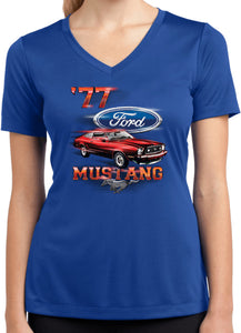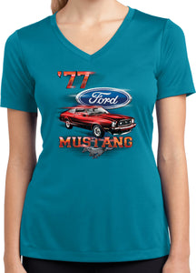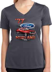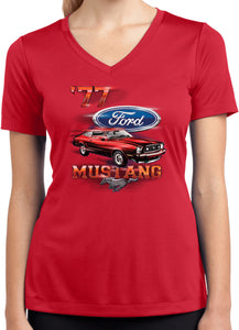 - A red 1977 Ford Mustang ladies dry wicking v-neck