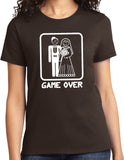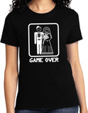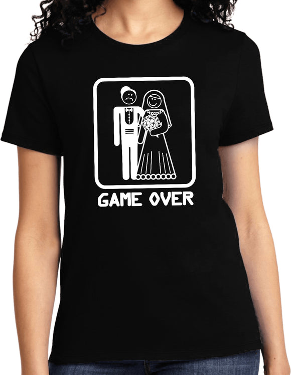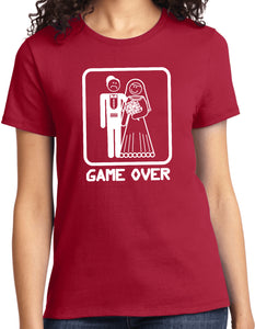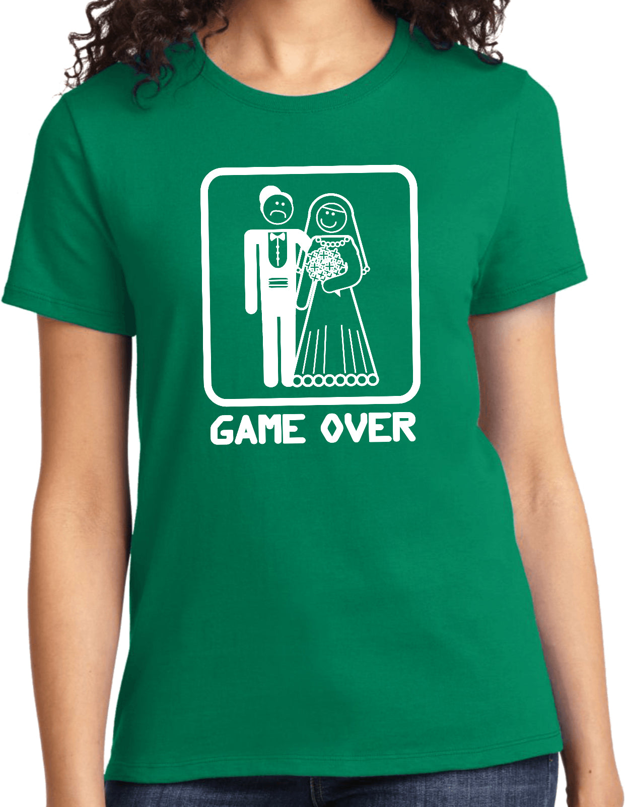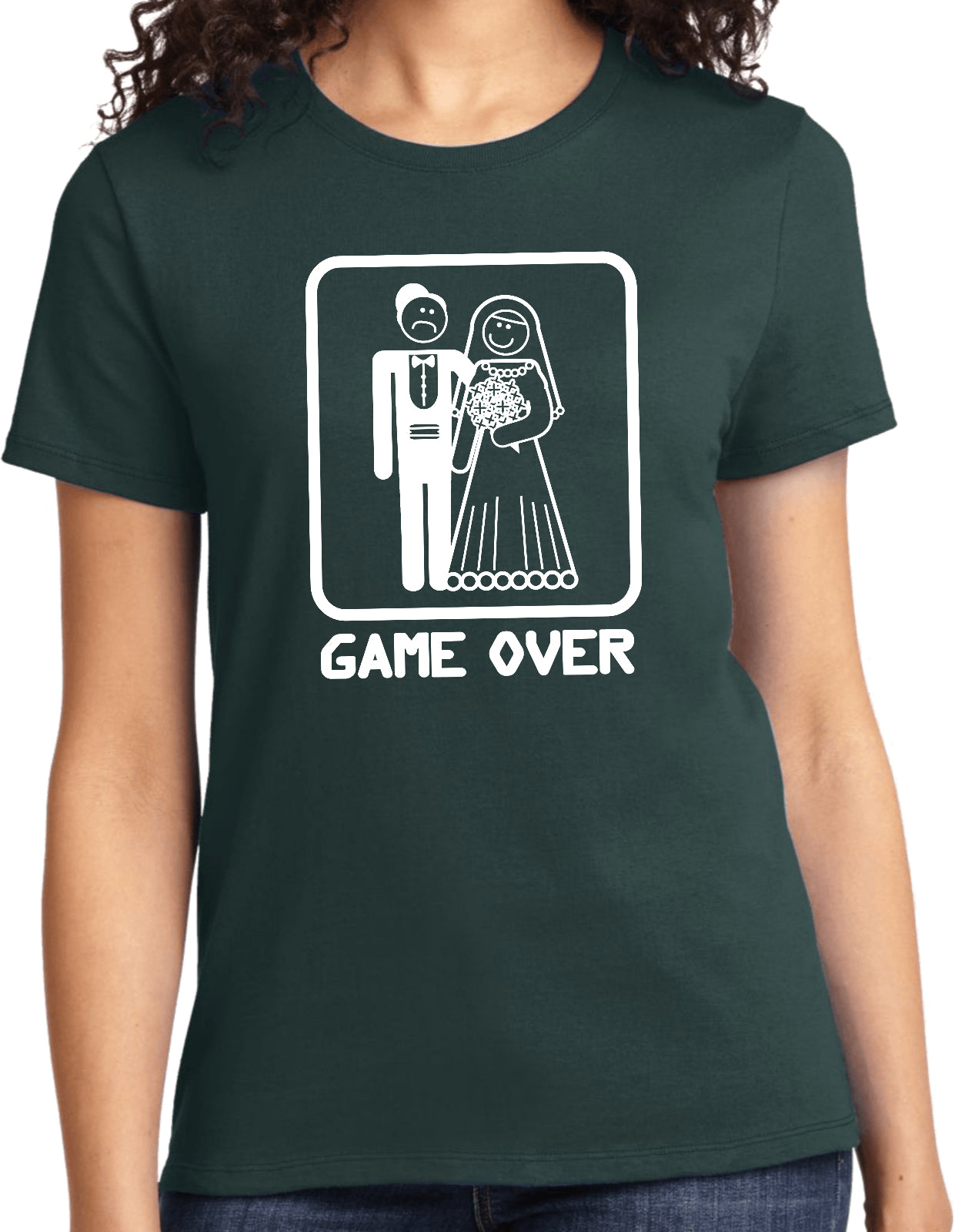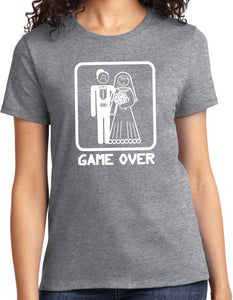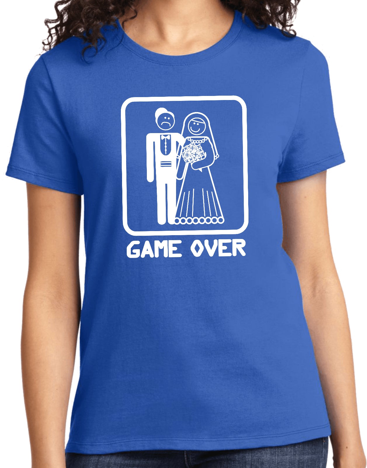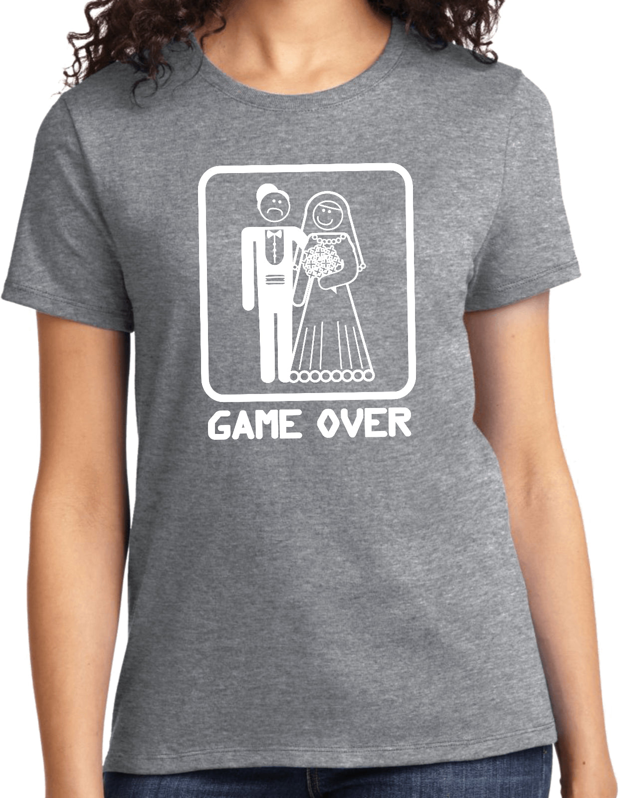 A funny Game Over Marriage design on a 100% cotton ladies shirt. (Athletic Heather is made with a blend of cotton/poly)