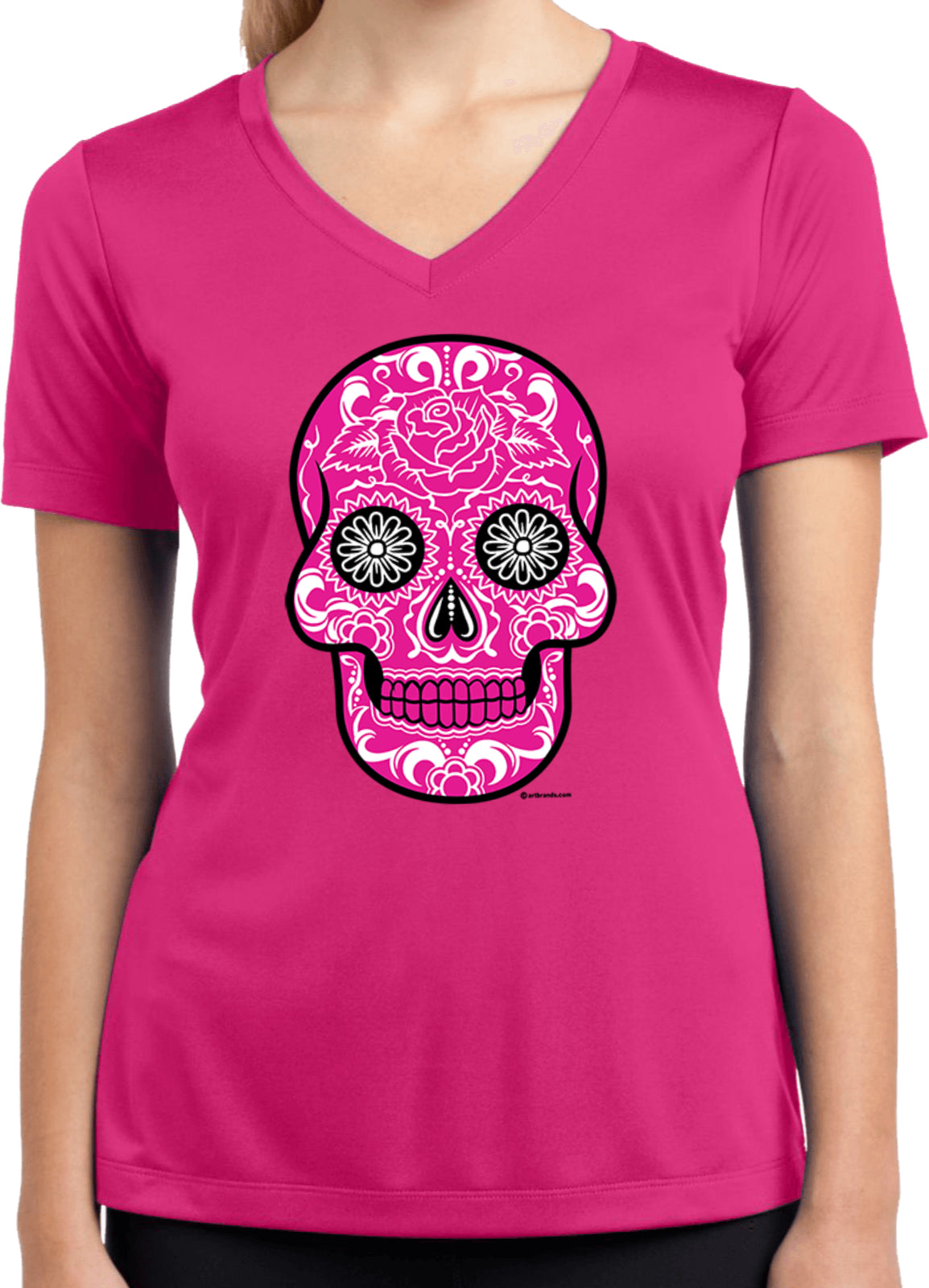 - A ladies dry wicking v-neck shirt featuring a pink sugar skull