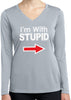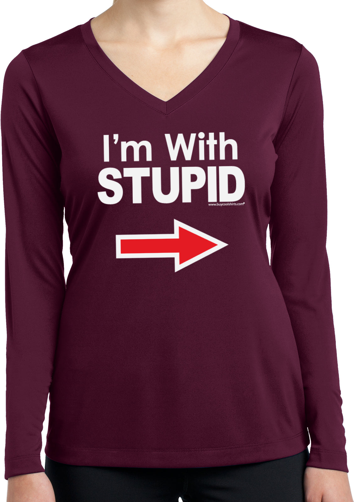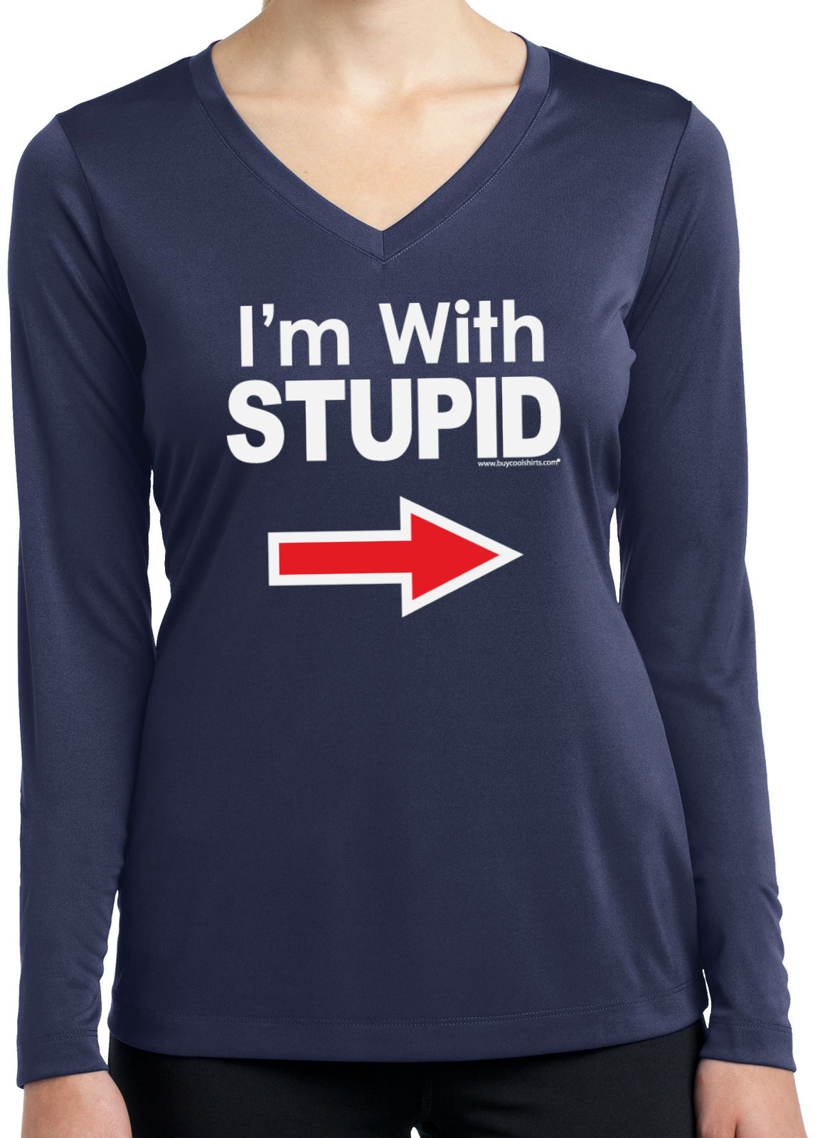 - A ladies dry wicking long sleeve v-neck featuring I'm With Stupid