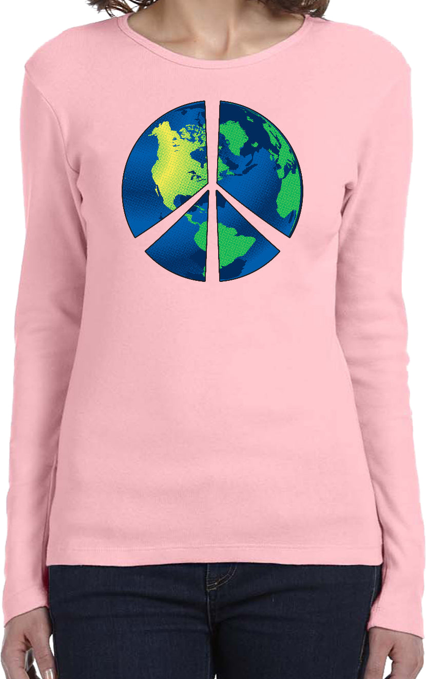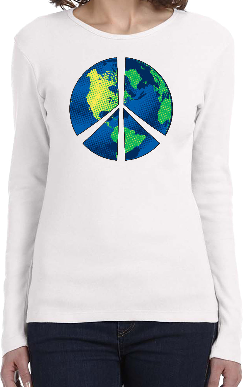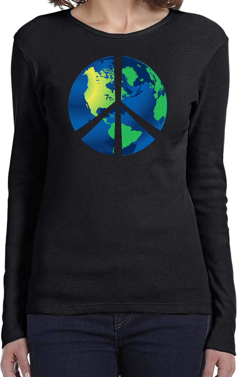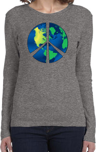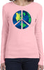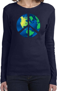 - A ladies long sleeve featuring a blue peace earth symbol