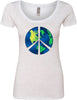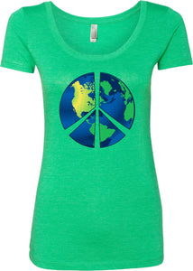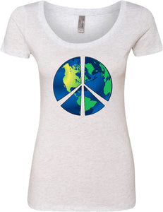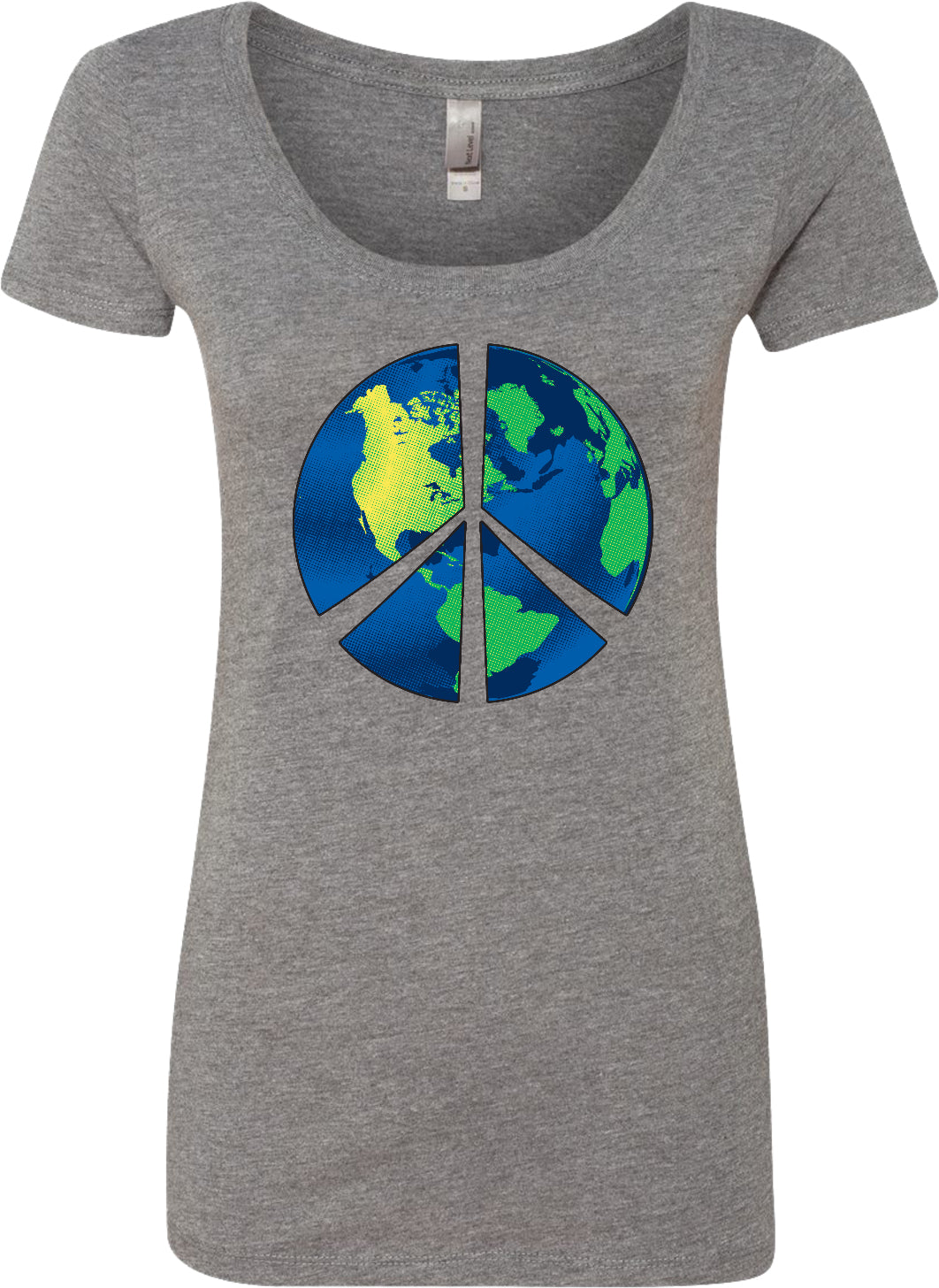 - A ladies scoop neck shirt featuring a blue peace earth symbol