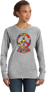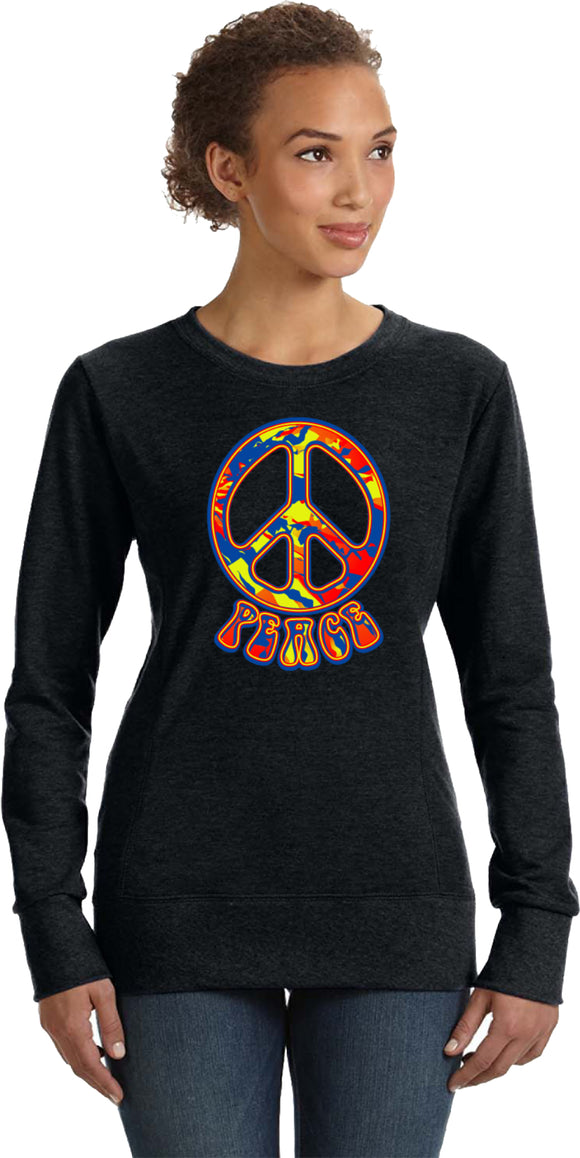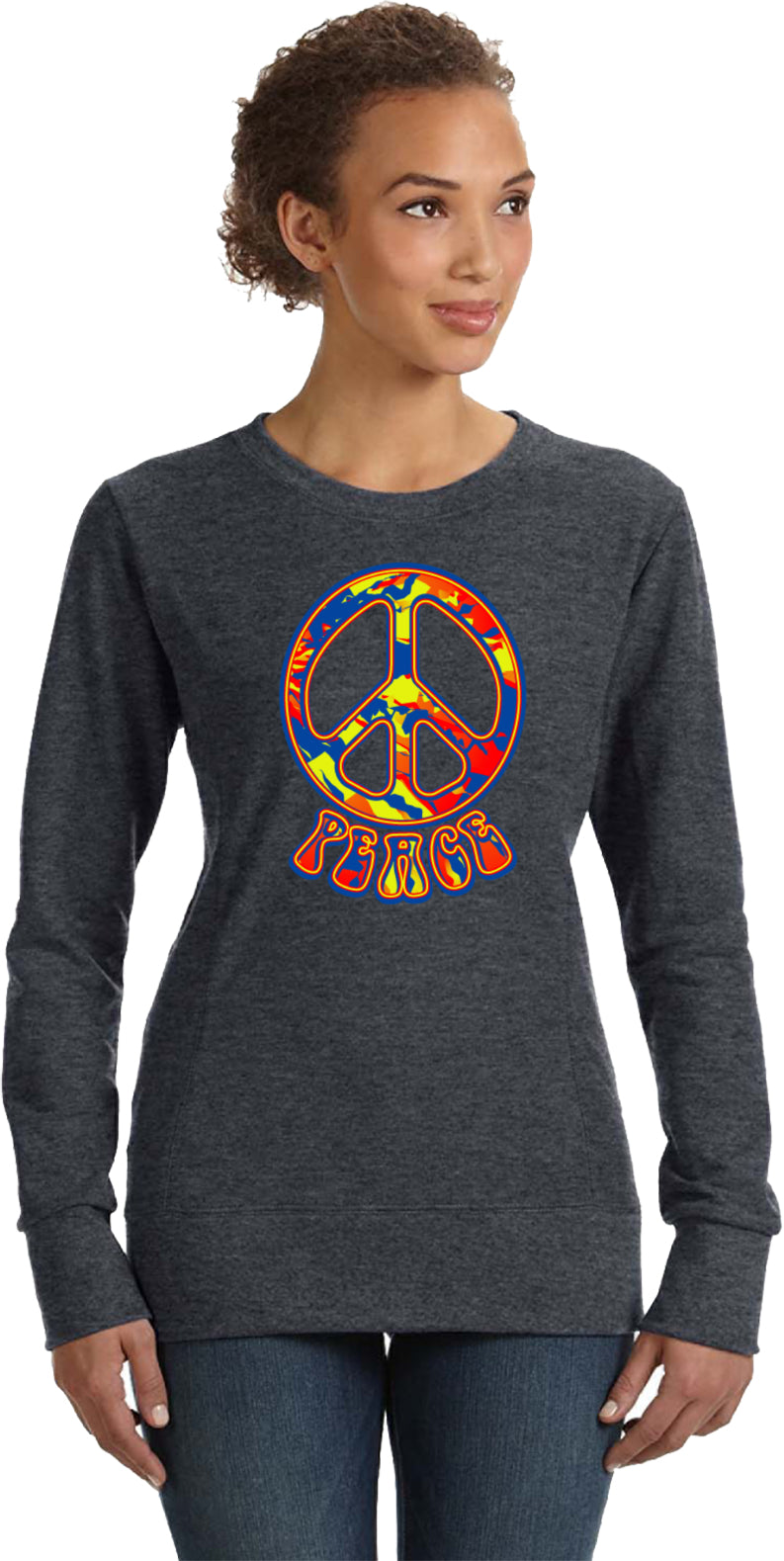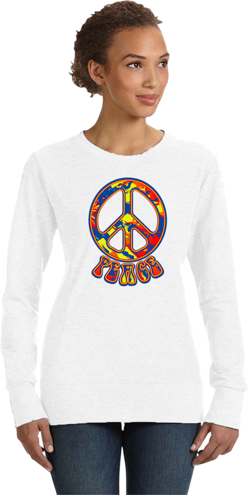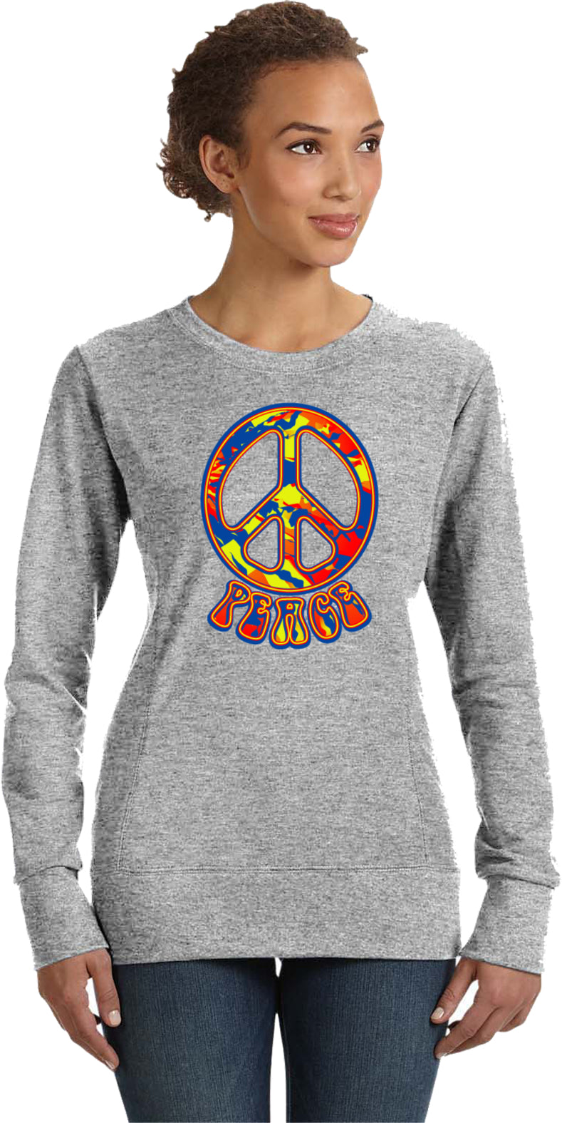 - A ladies lightweight sweatshirt featuring a funky 70's peace sign