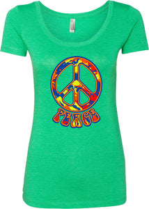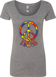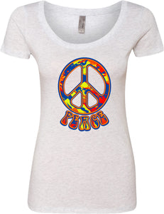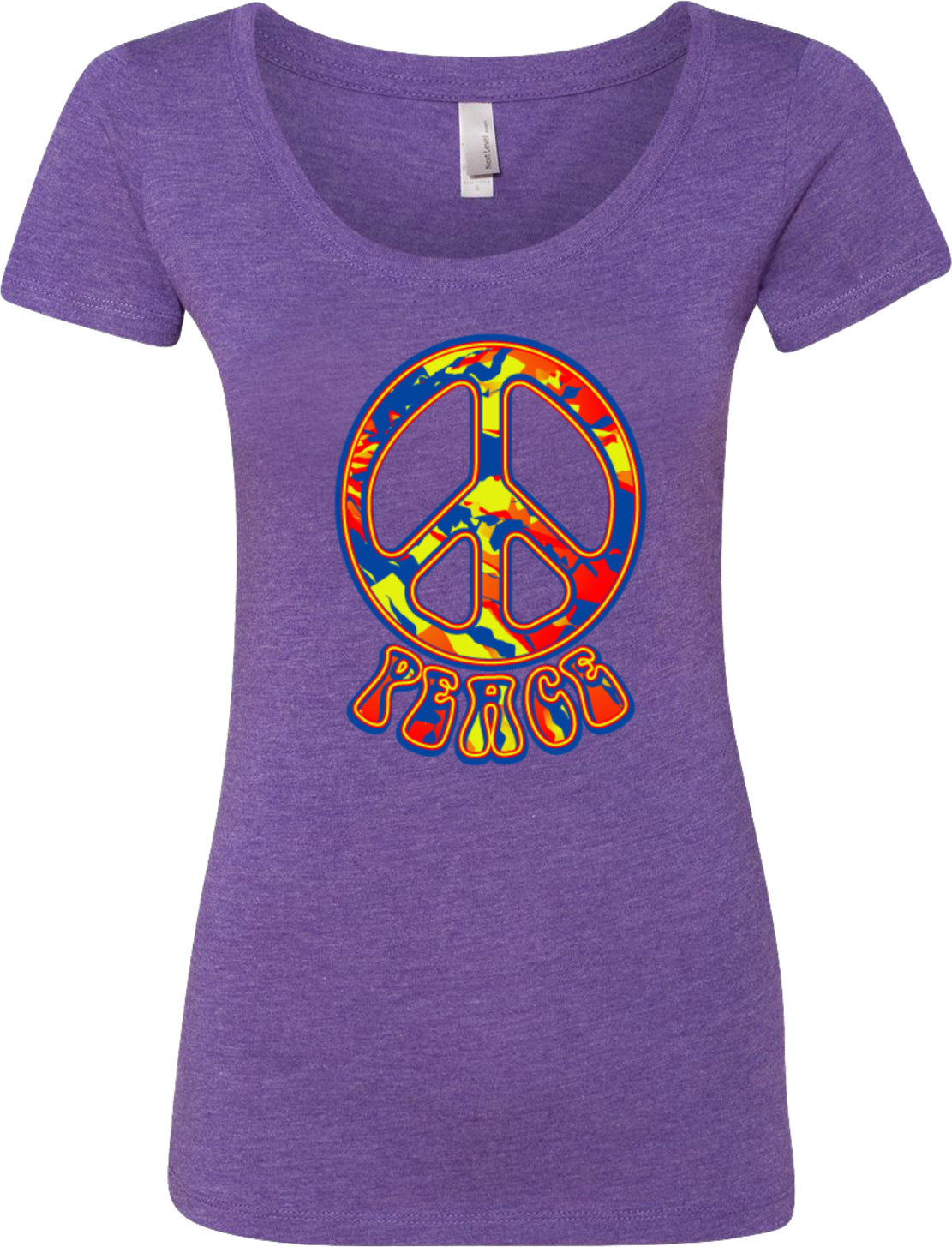 - A ladies scoop neck shirt featuring a funky 70's peace sign