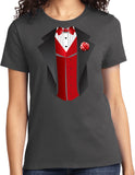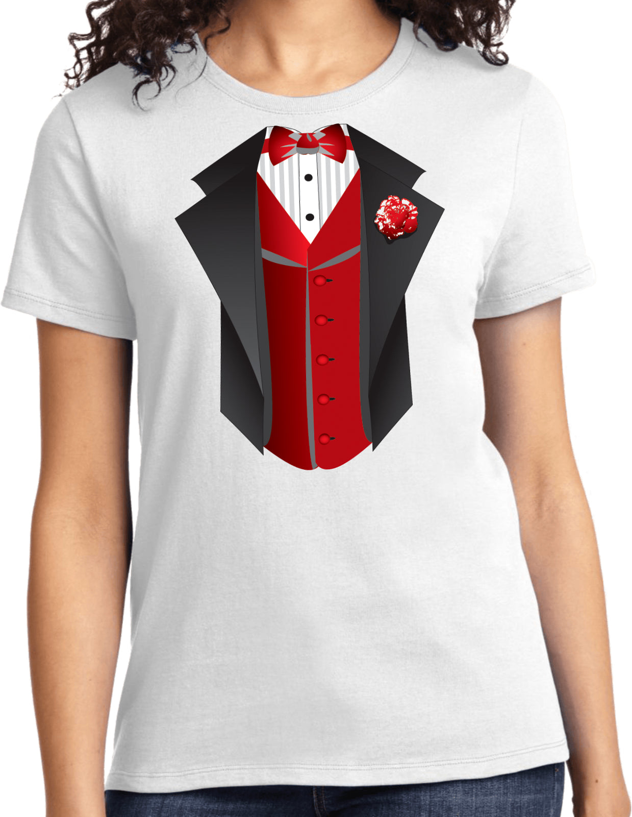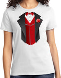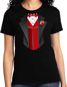 • A ladies t-shirt featuring a red vest tuxedo