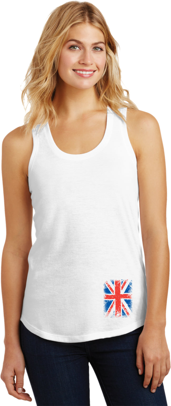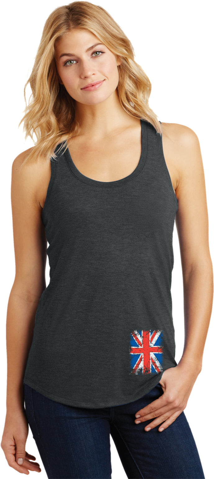 - A ladies racerback featuring a Union Jack Flag at the bottom