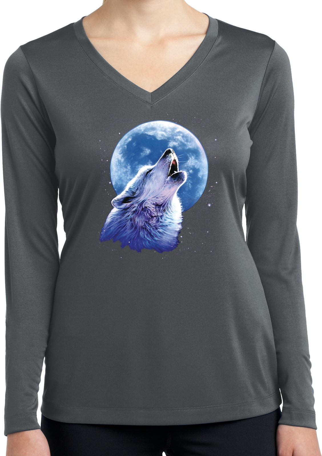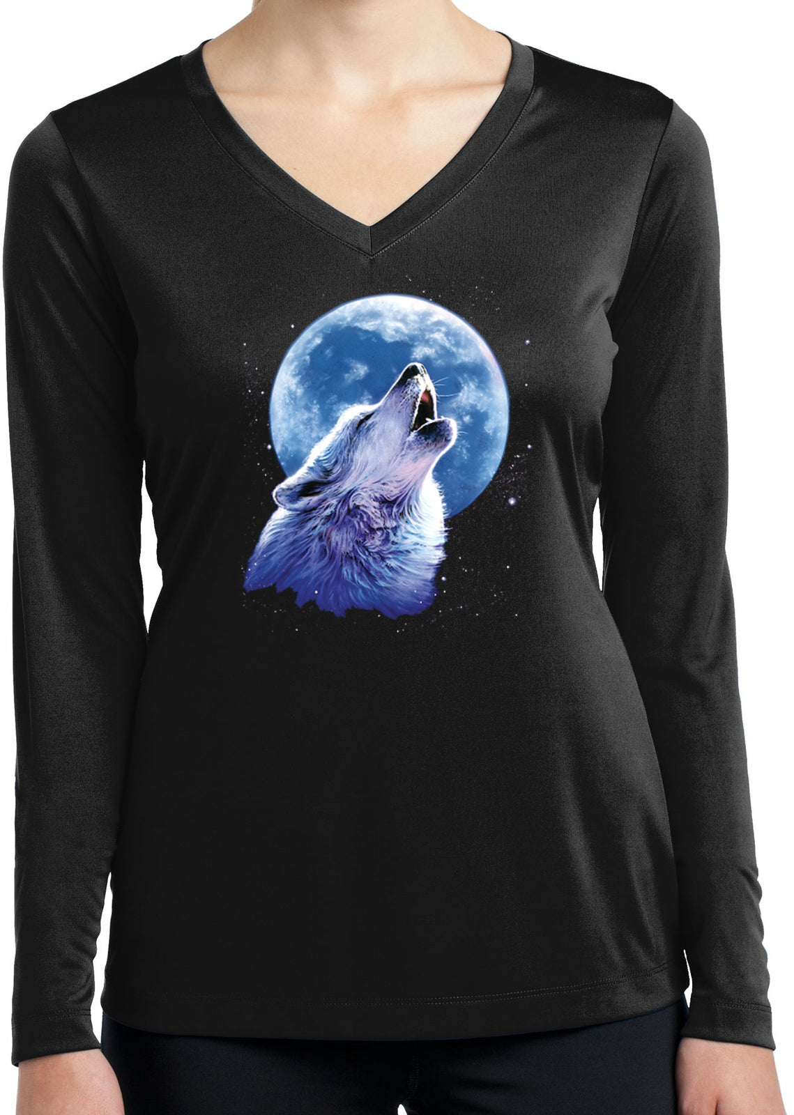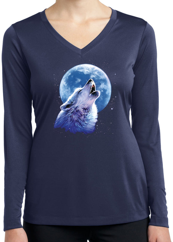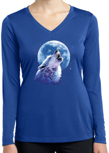 - A ladies dry wicking long sleeve v-neck featuring a wolf howling at the moon