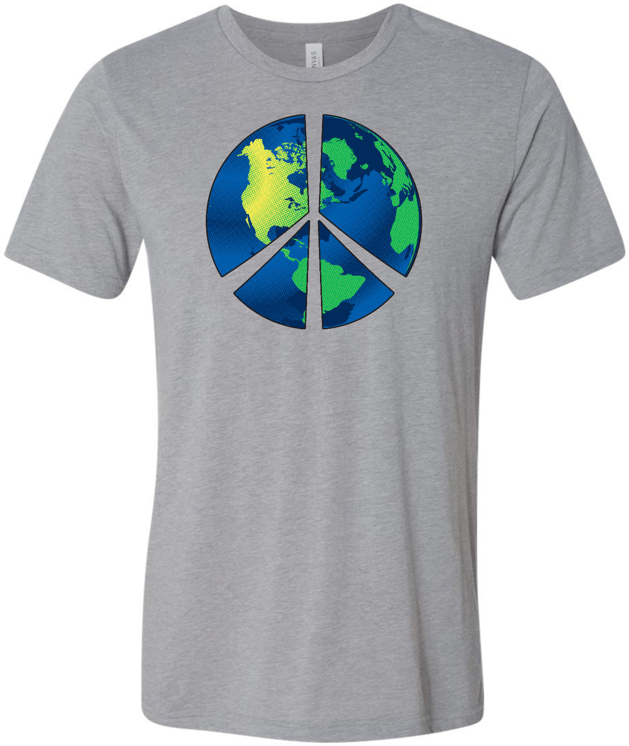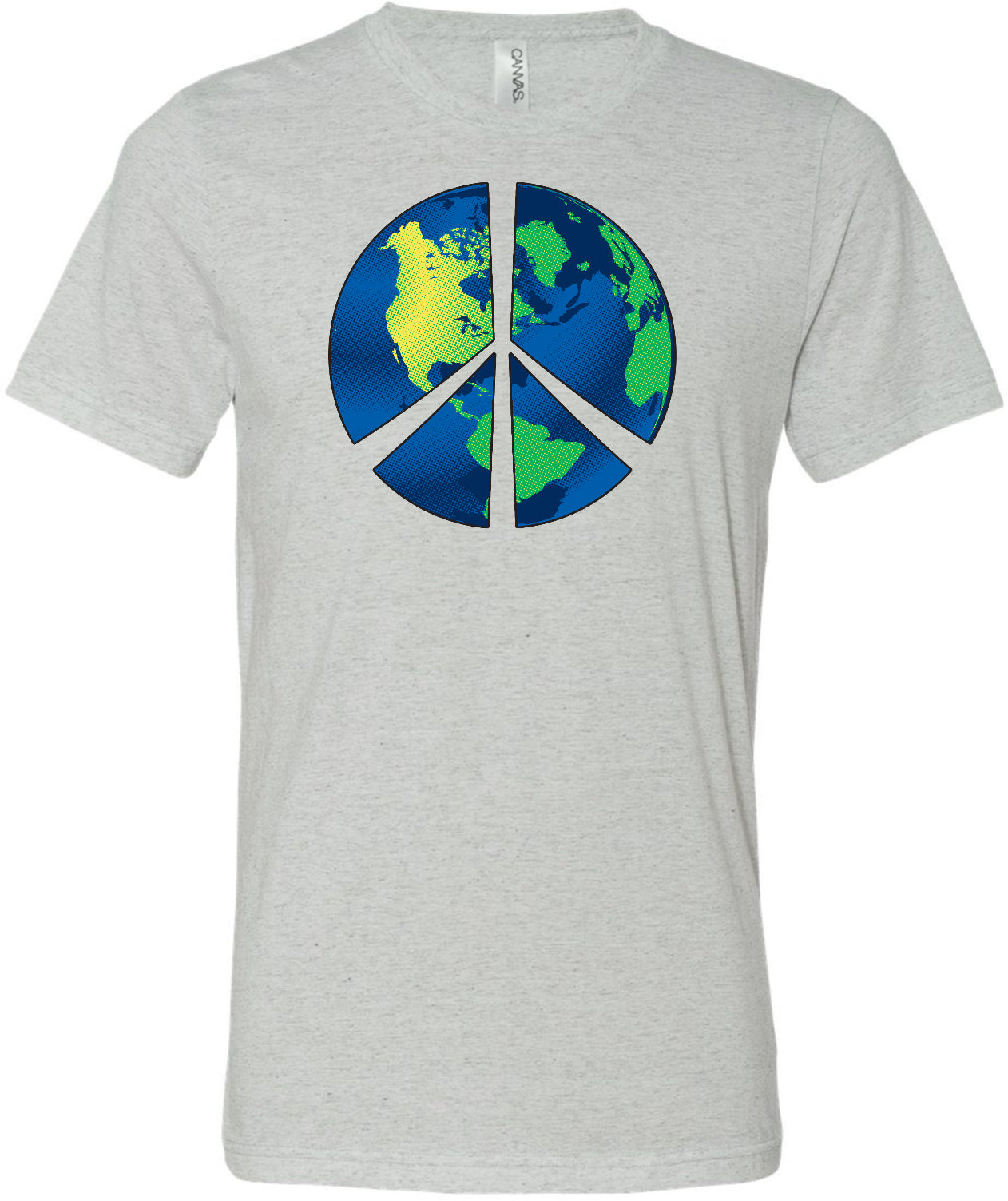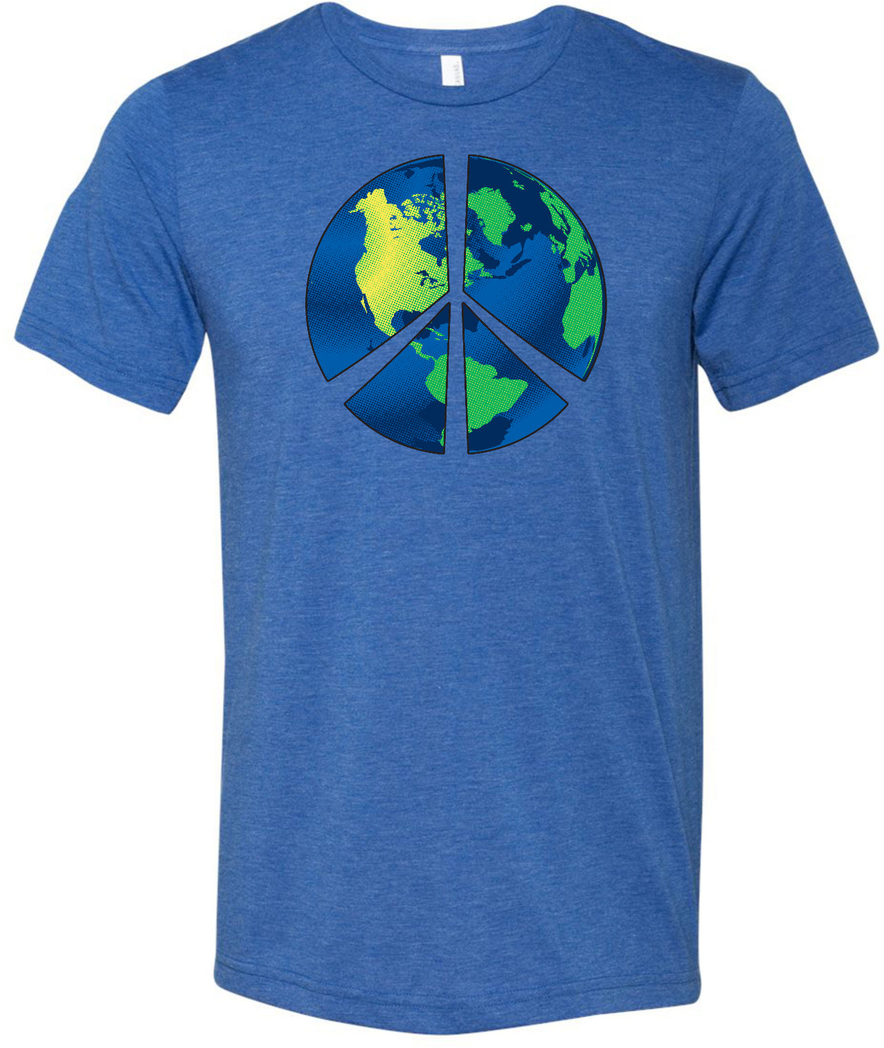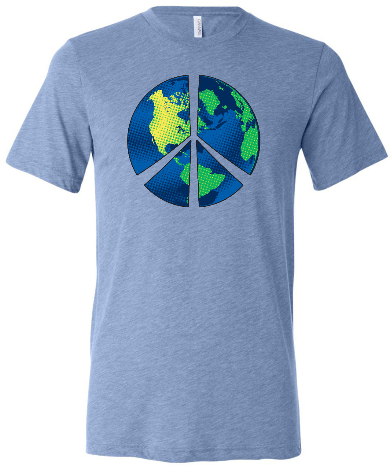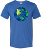 • A mens tri blend t-shirt featuring a blue peace earth symbol