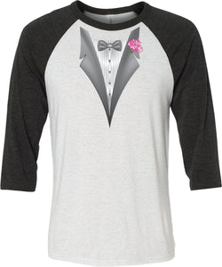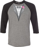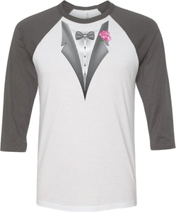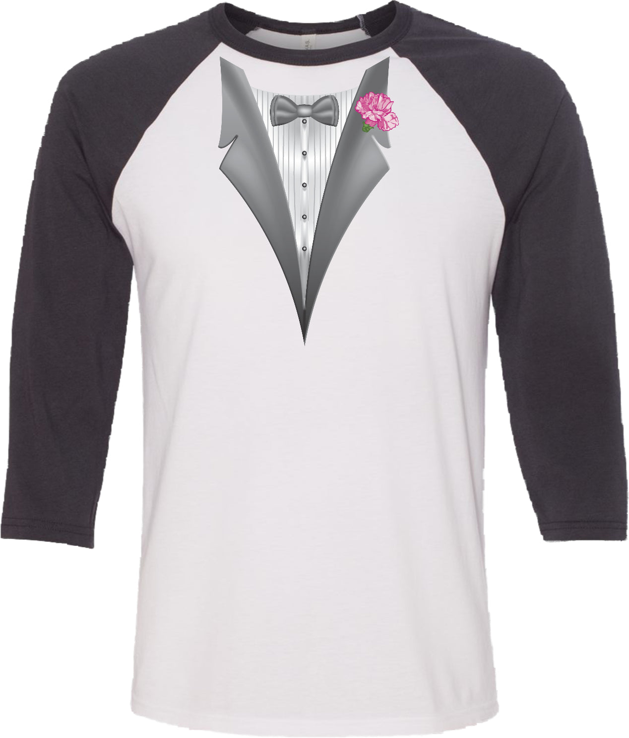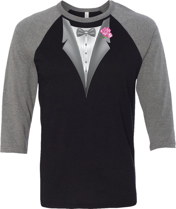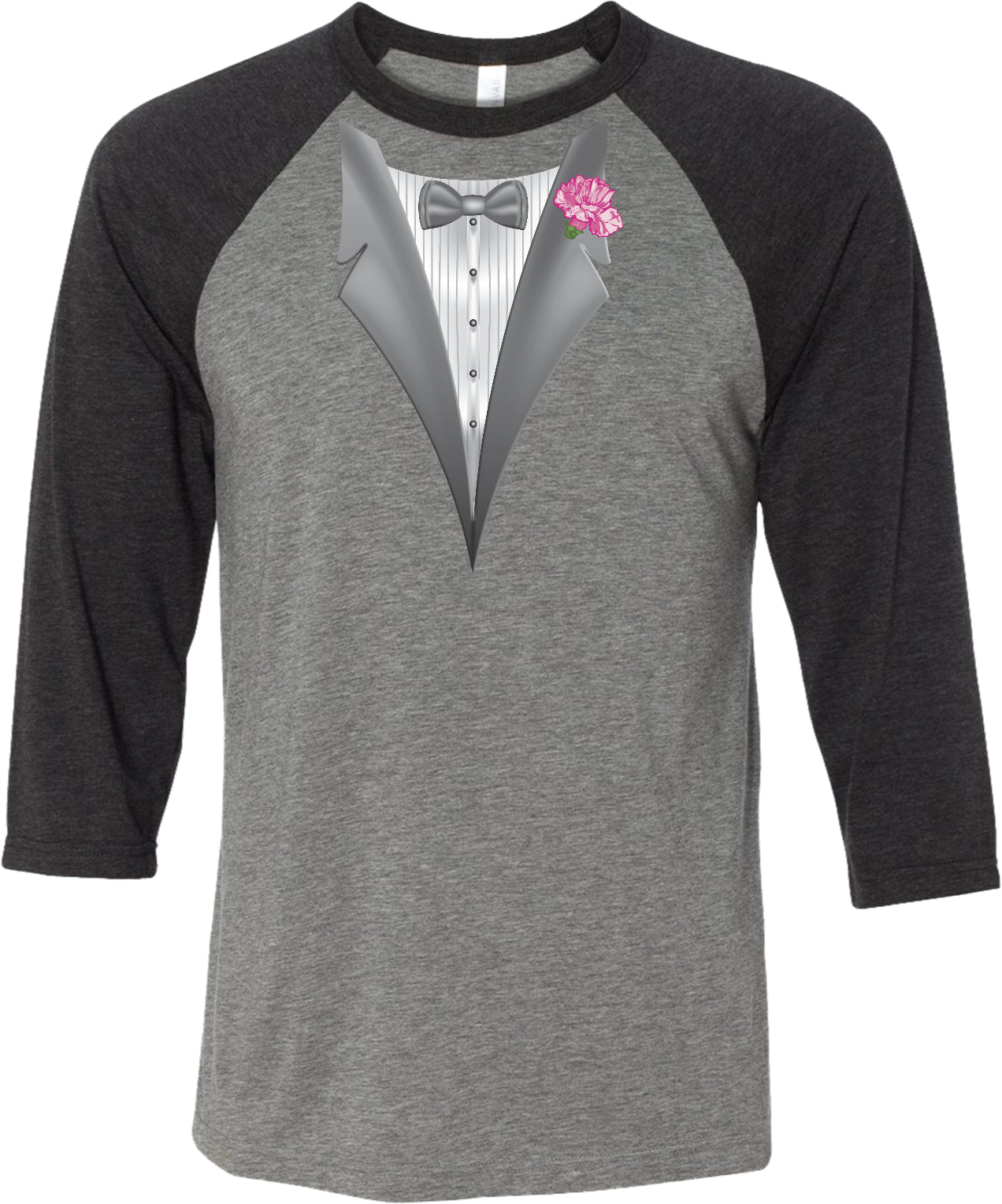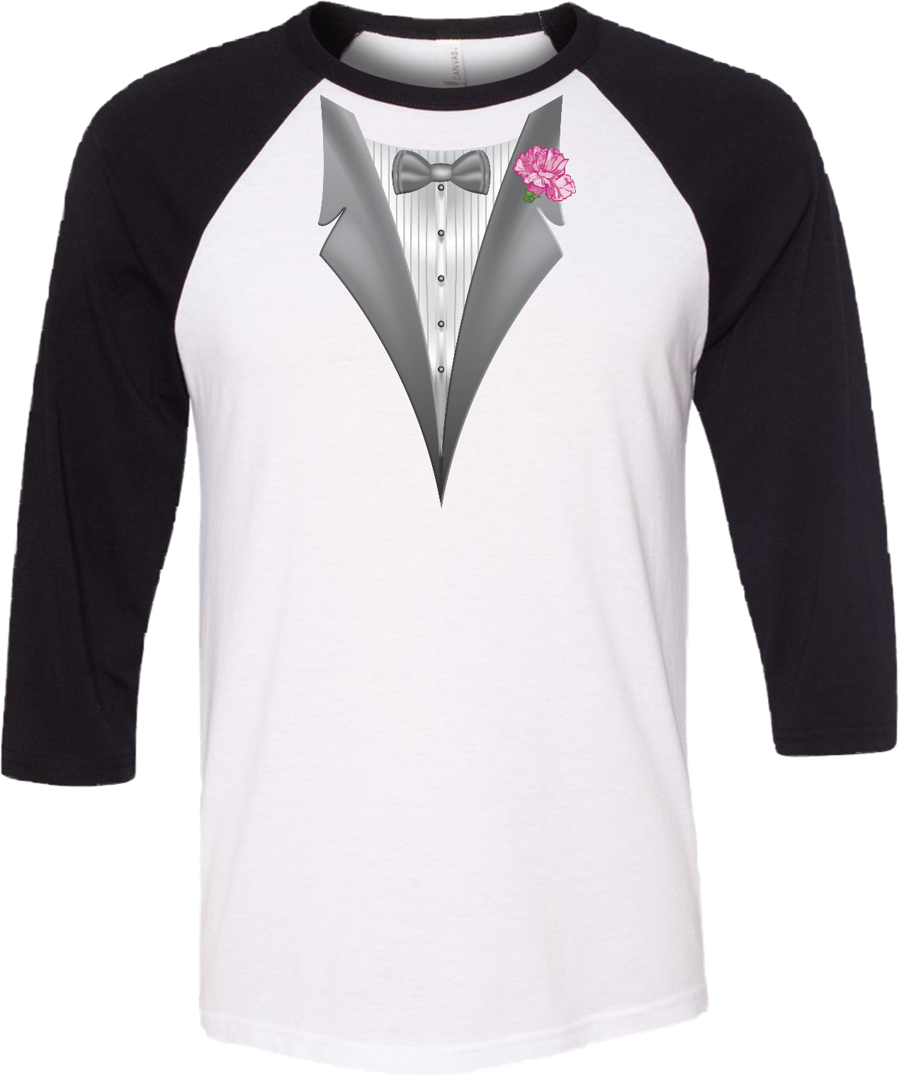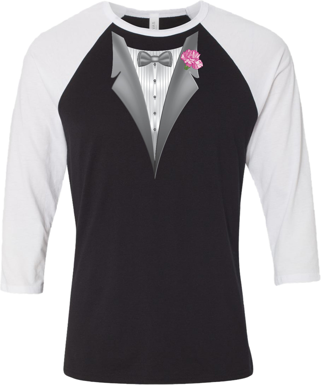 - A mens raglan shirt featuring a tuxedo with a pink carnation flower
