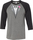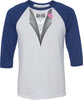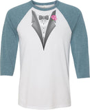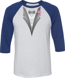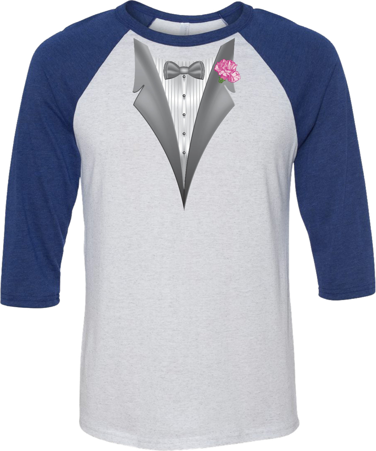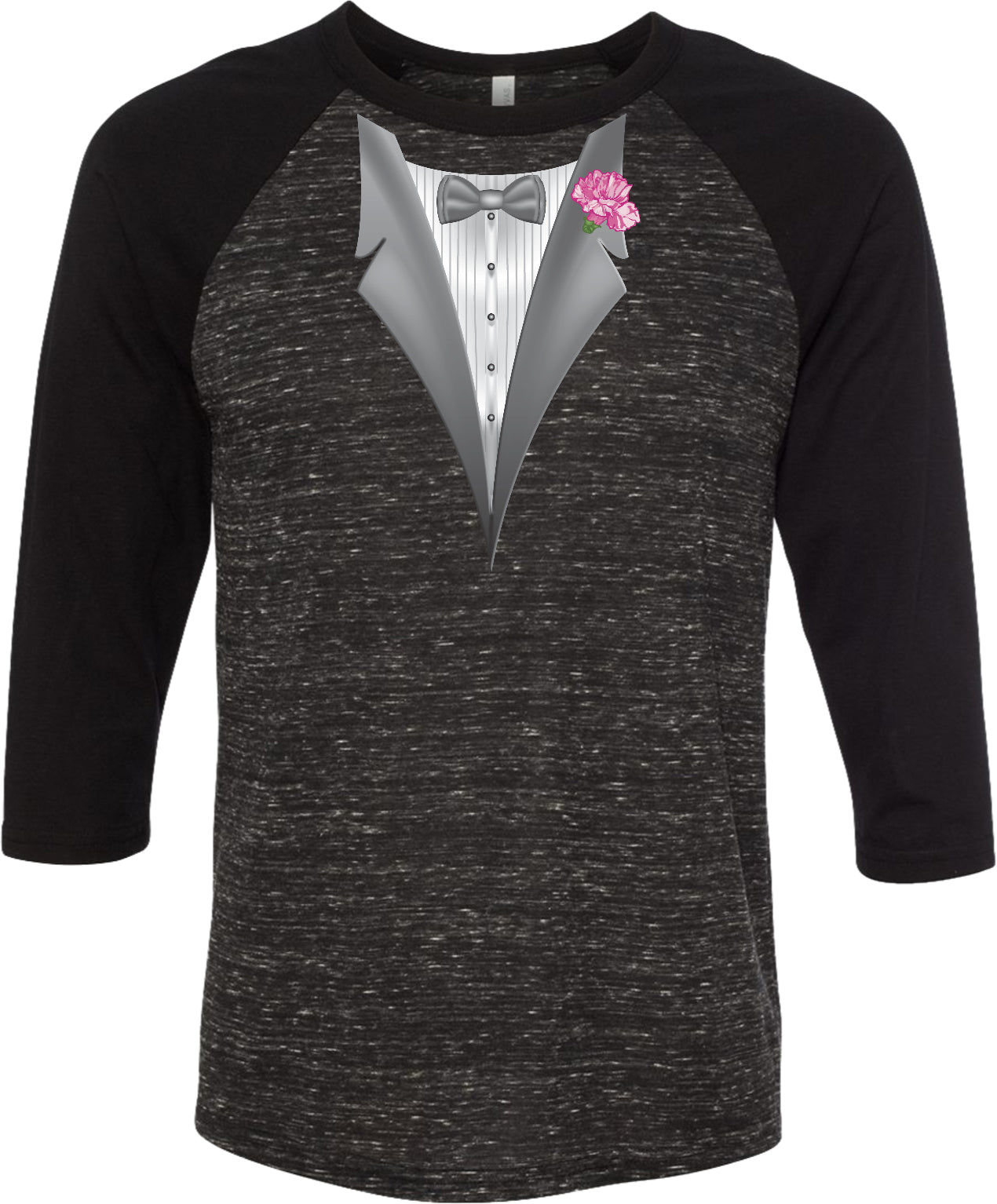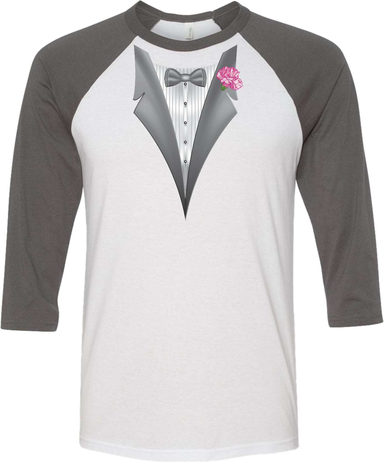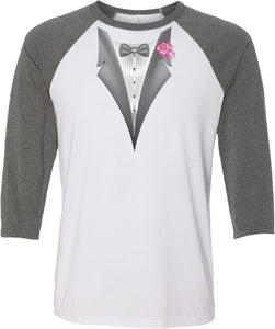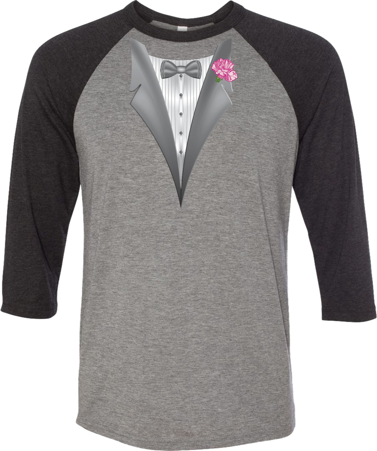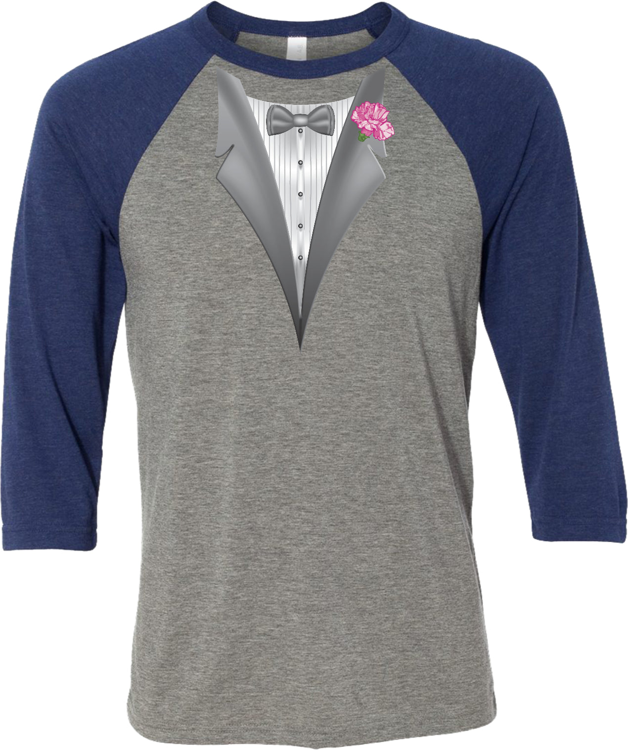 - A mens raglan shirt featuring a tuxedo with a pink carnation flower
