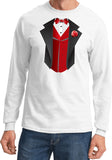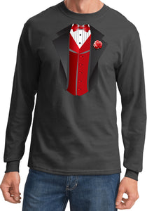 - A mens long sleeve shirt featuring a red vest tuxedo