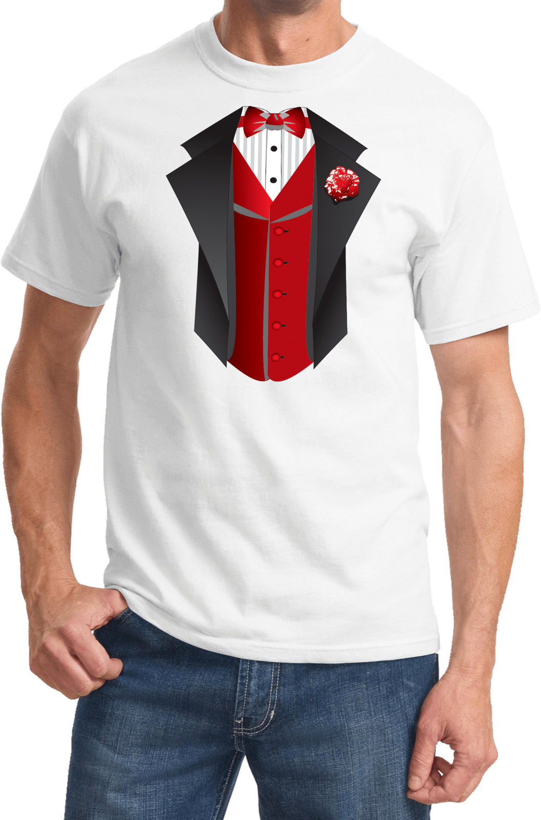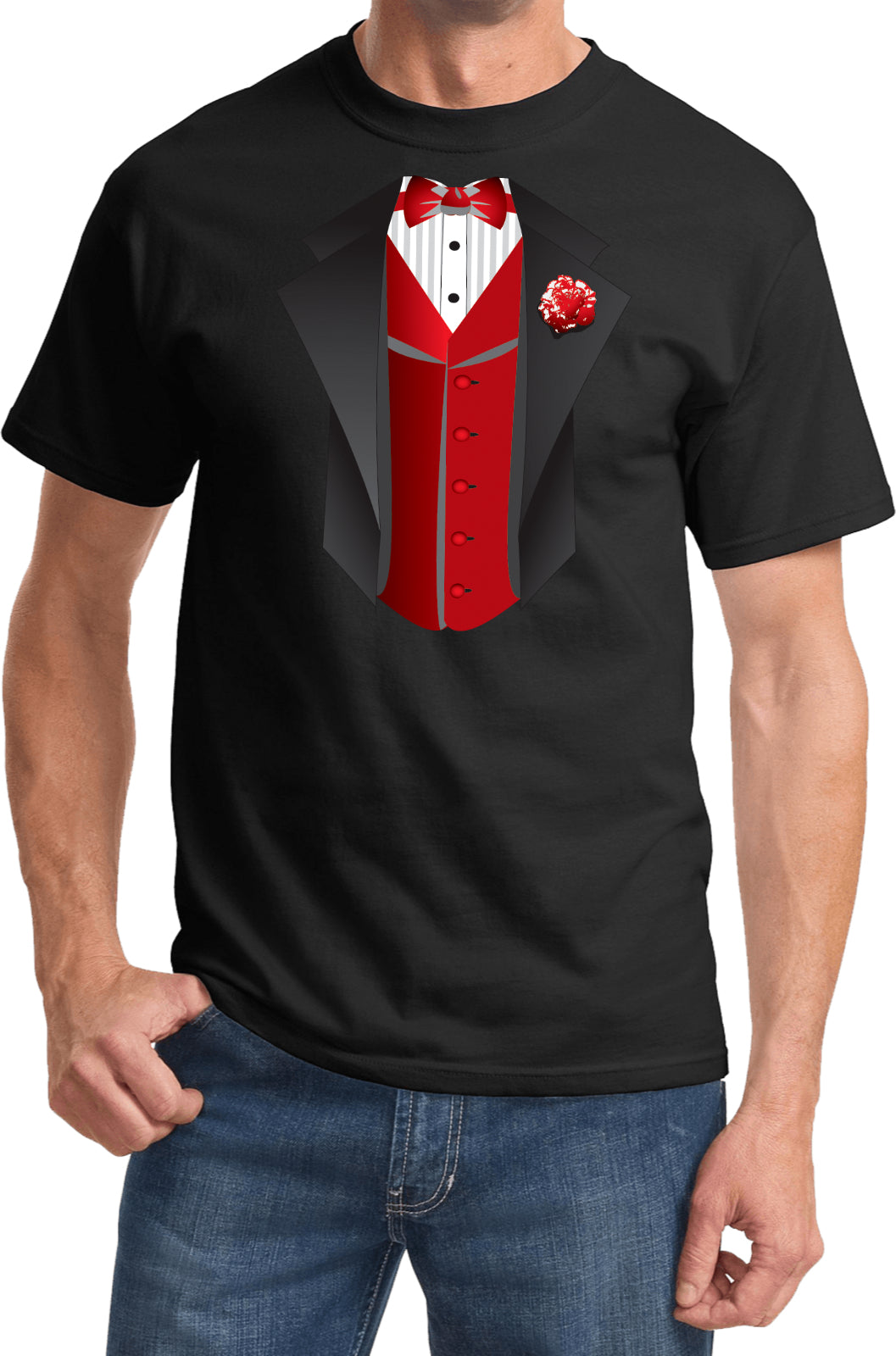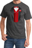 • A mens t-shirt featuring a red vest tuxedo