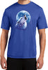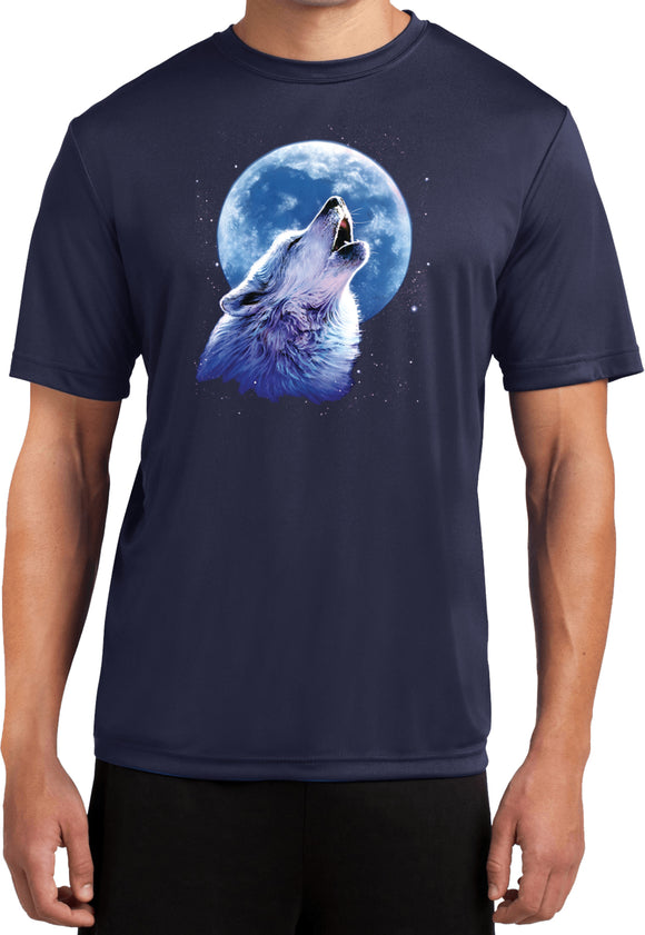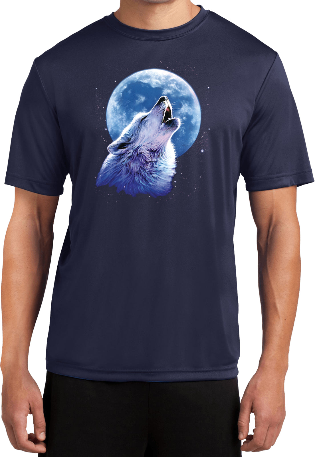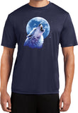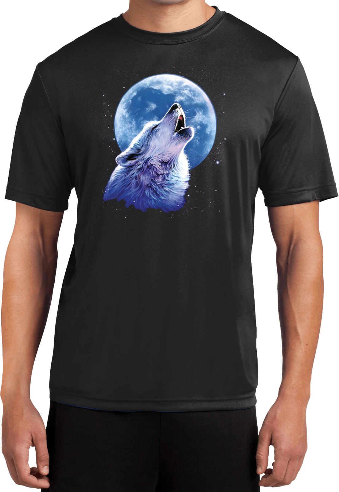 - A mens dry wicking t-shirt featuring a wolf howling at the moon