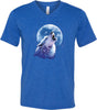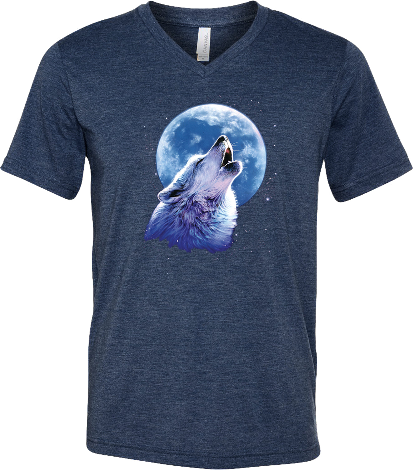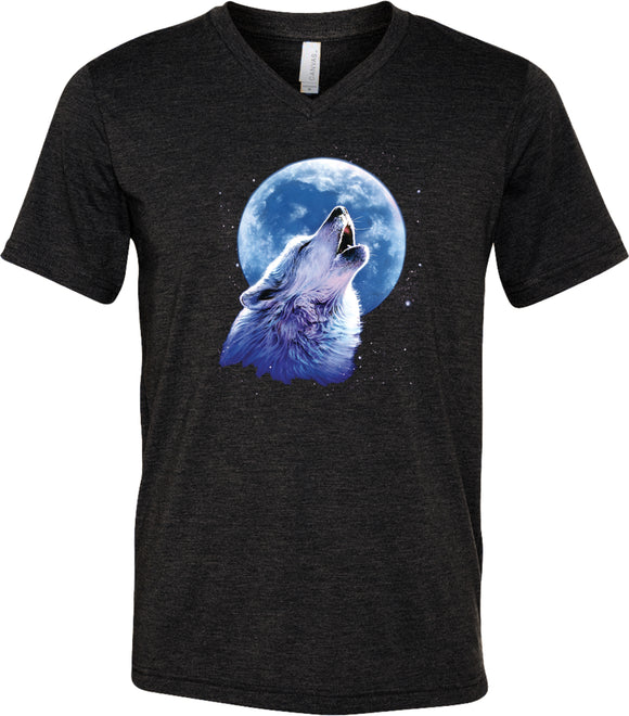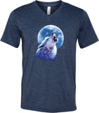 - A mens tri blend v-neck featuring a wolf howling at the moon