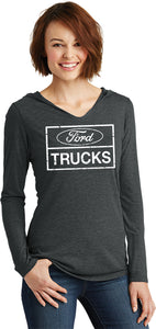 - A ladies lightweight v-neck hoodie featuring a vintage Ford Trucks design