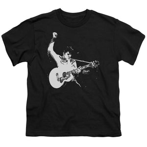 - An Elvis Presley Kids T-shirt featuring a black and white photo of Elvis playing the guitar