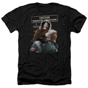 • A Fantastic Beasts: The Crimes of Grindelwald Heathered T-shirt featuring a pile up of Nifflers: Caution Magical Creature