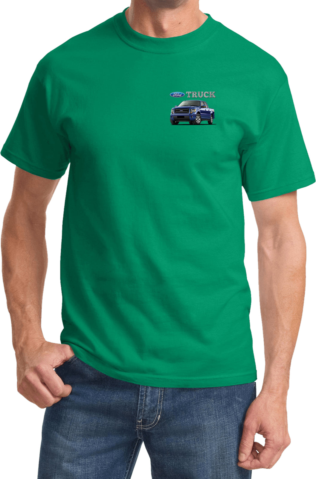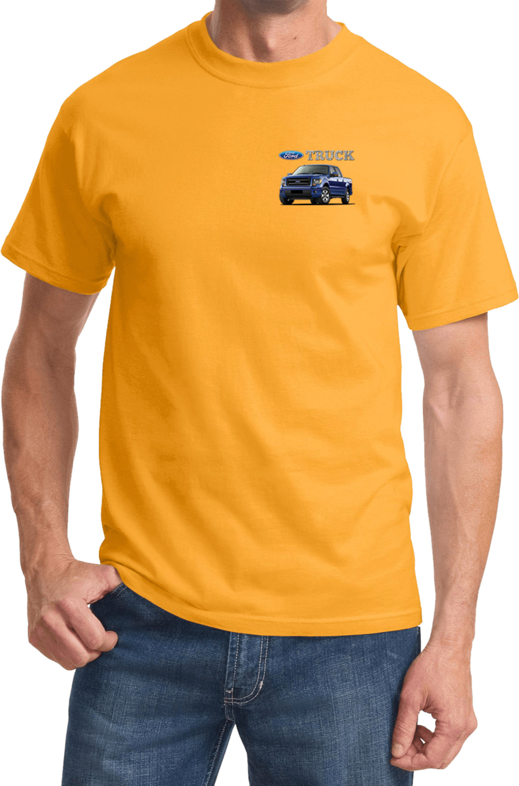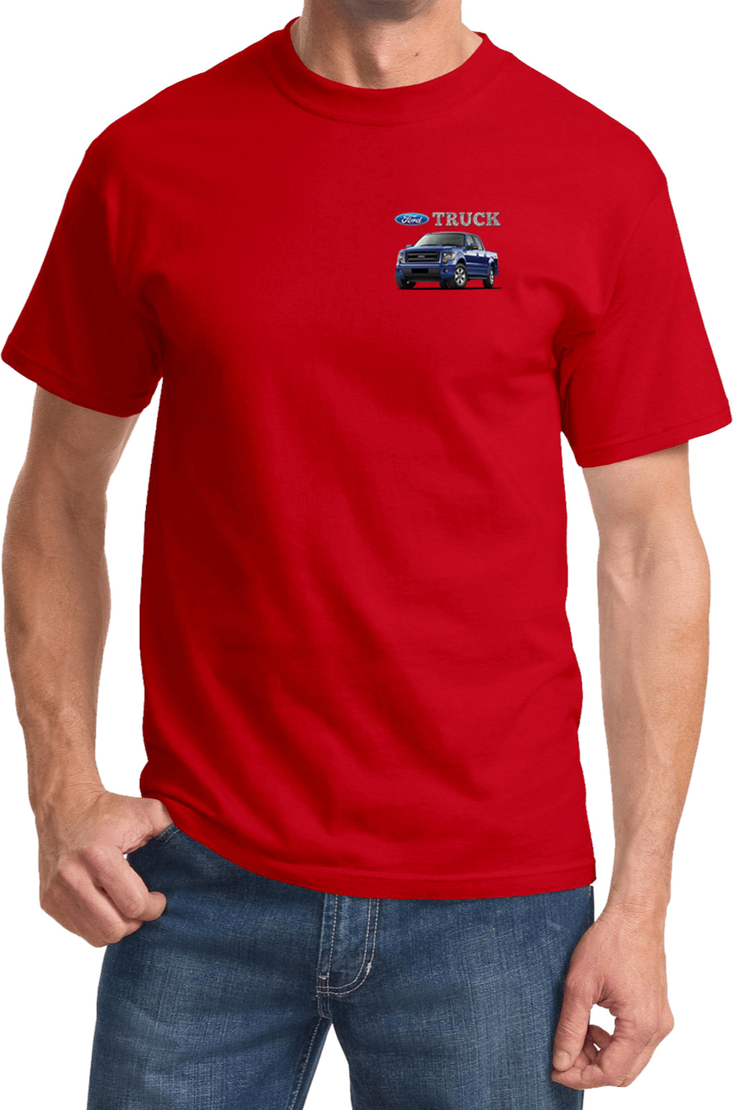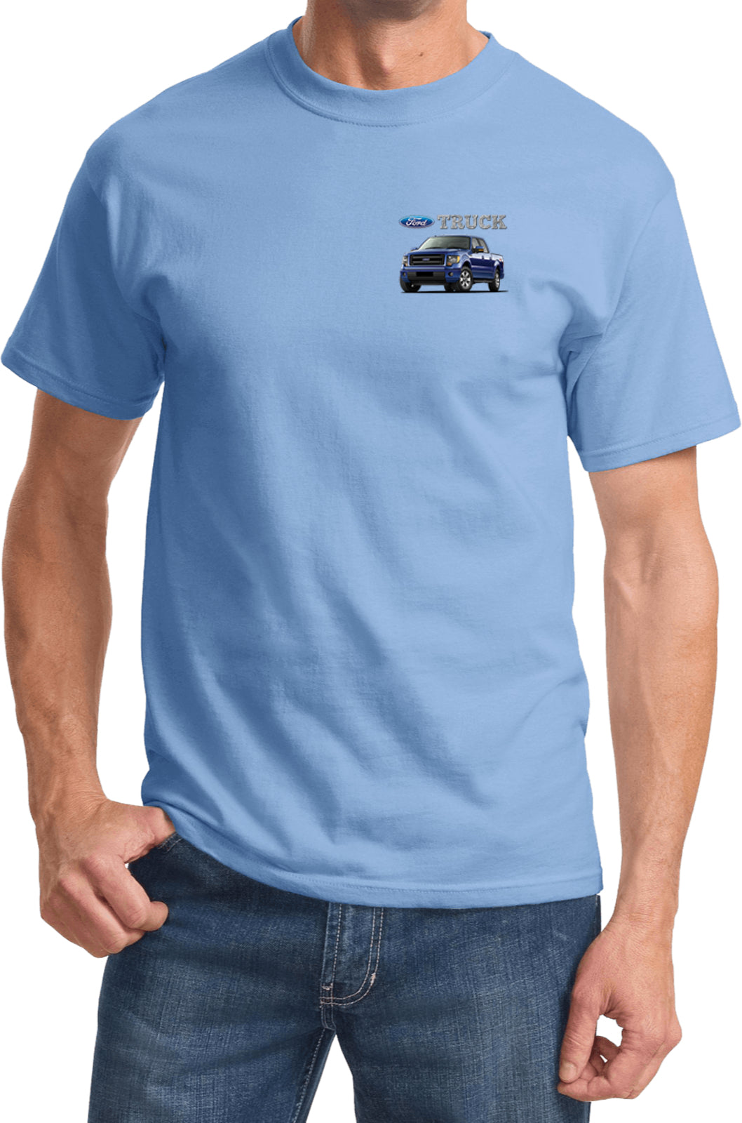 - A mens t-shirt featuring a blue Ford F-150 as a pocket print