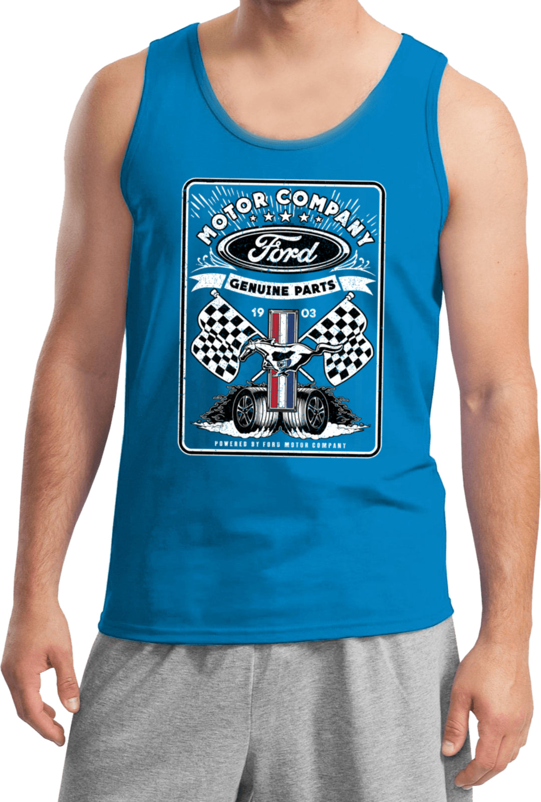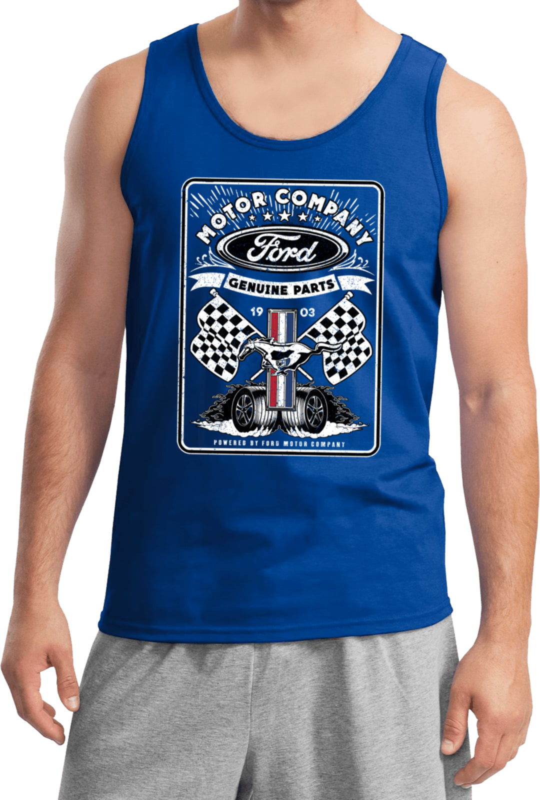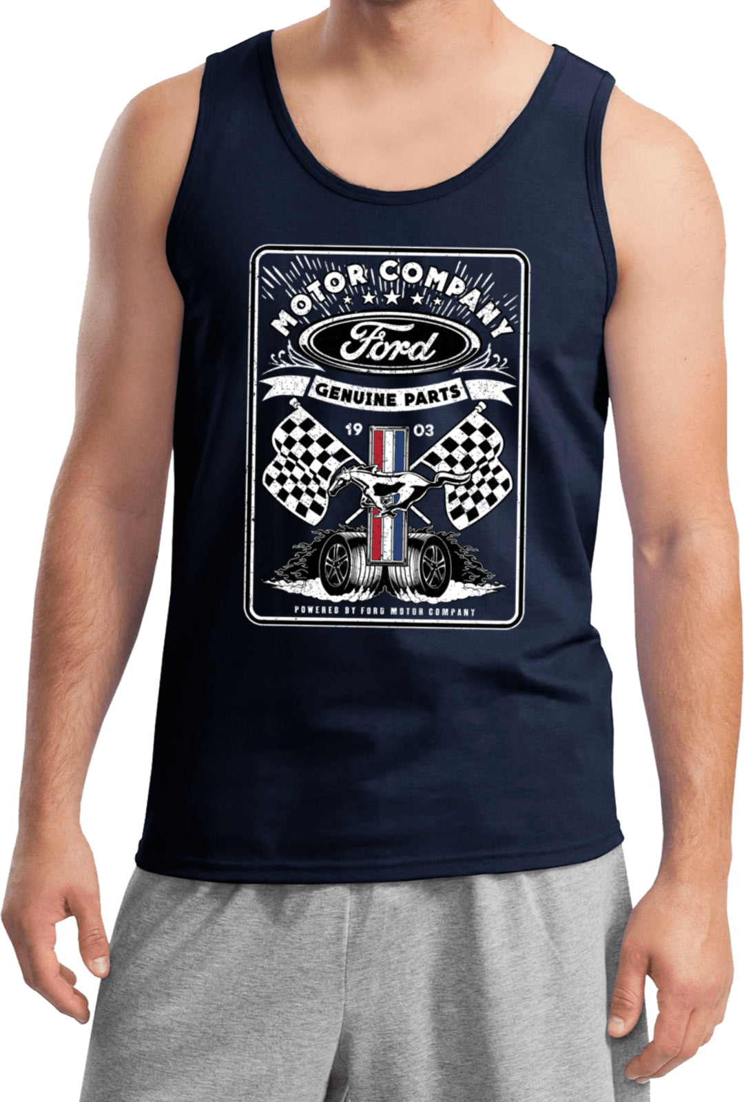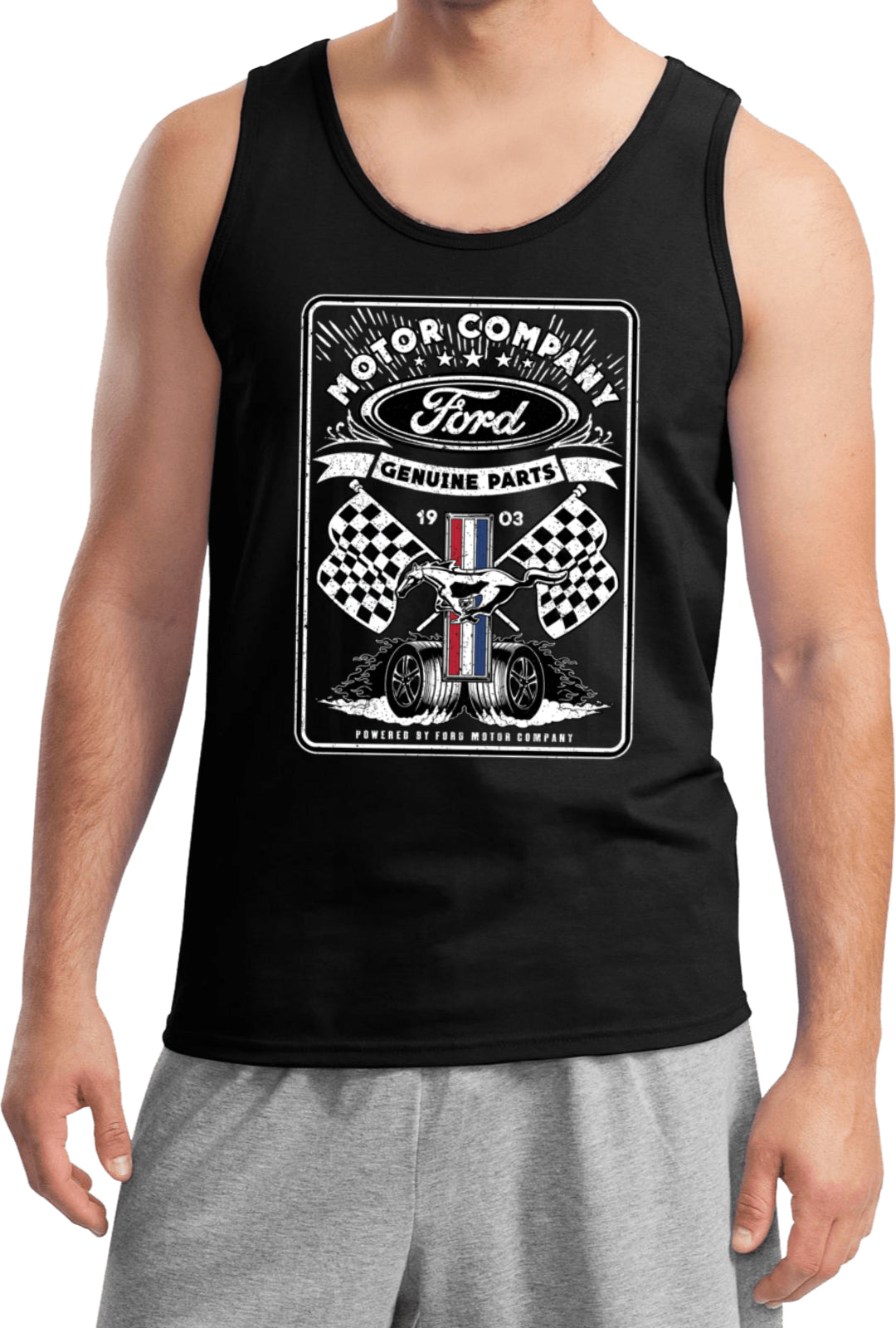 - A mens tank top featuring a Ford Motor Company Genuine Parts design with the Mustang Tri Bar logo surrounded by racing flags