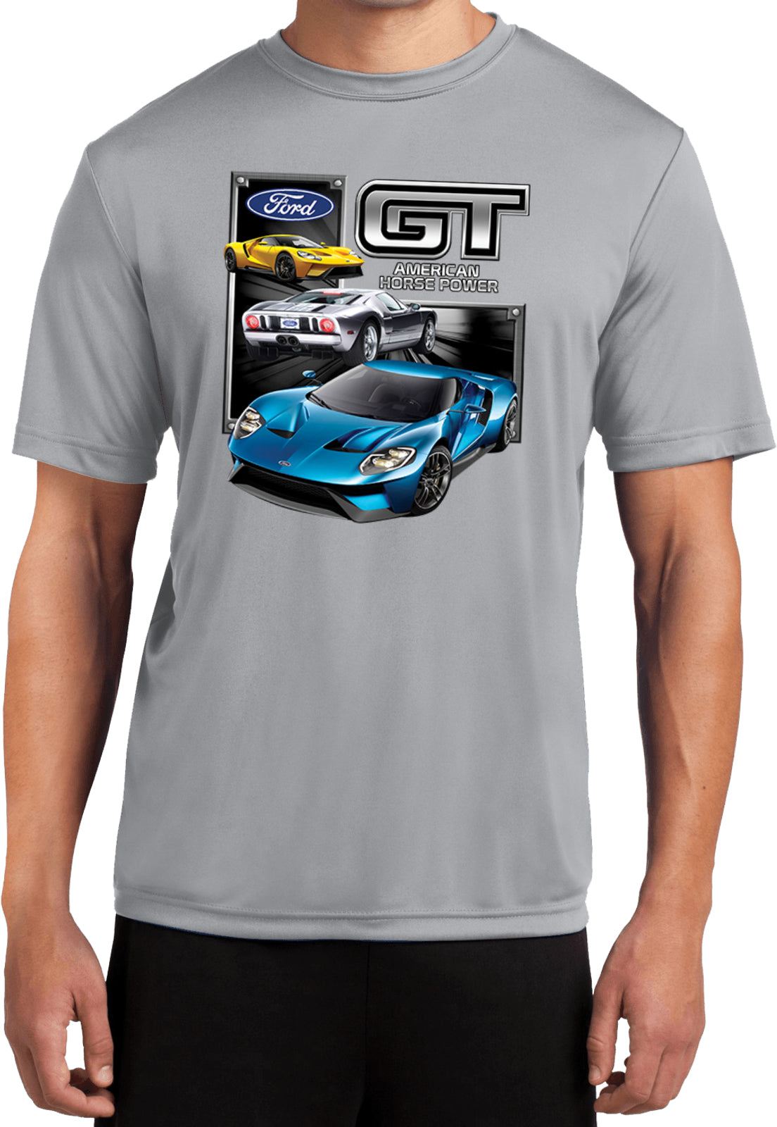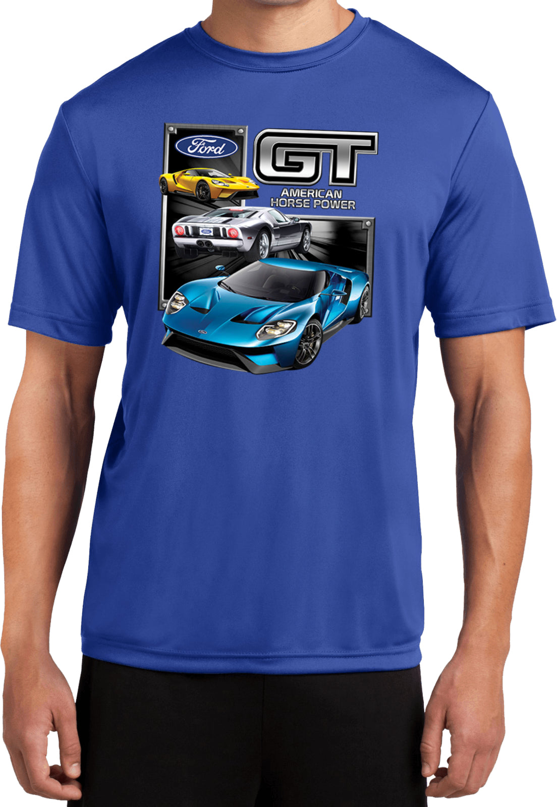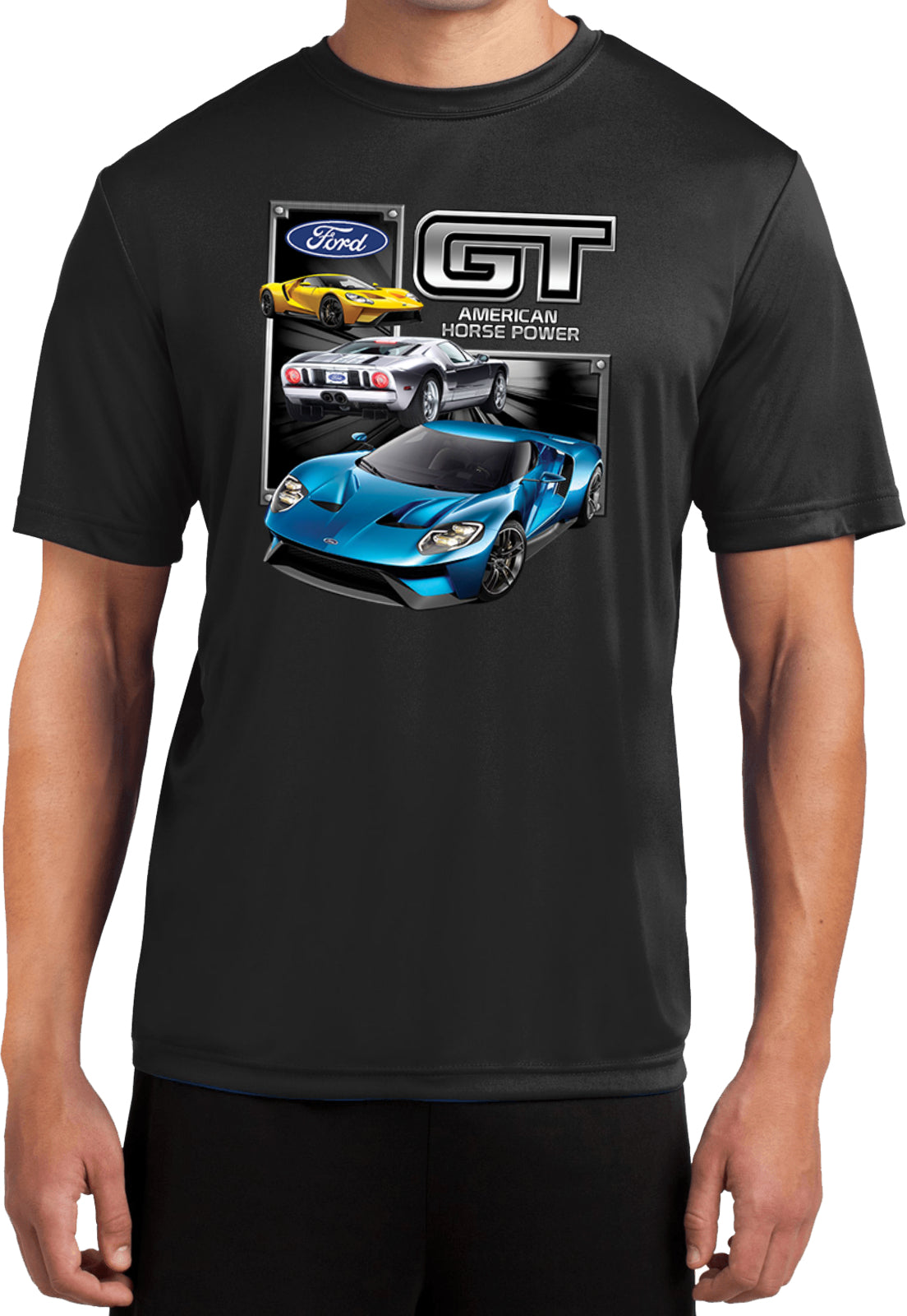 - A lightweight dry wicking t-shirt featuring a collage of the Ford GT Supercar