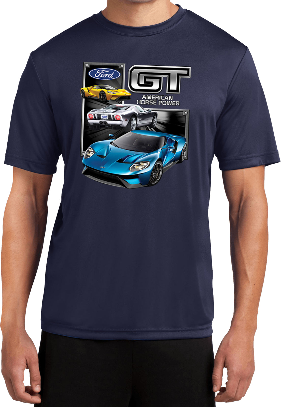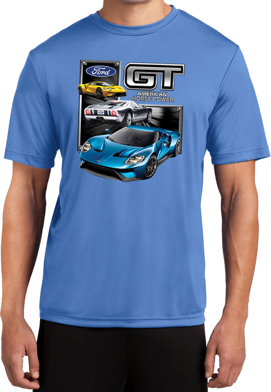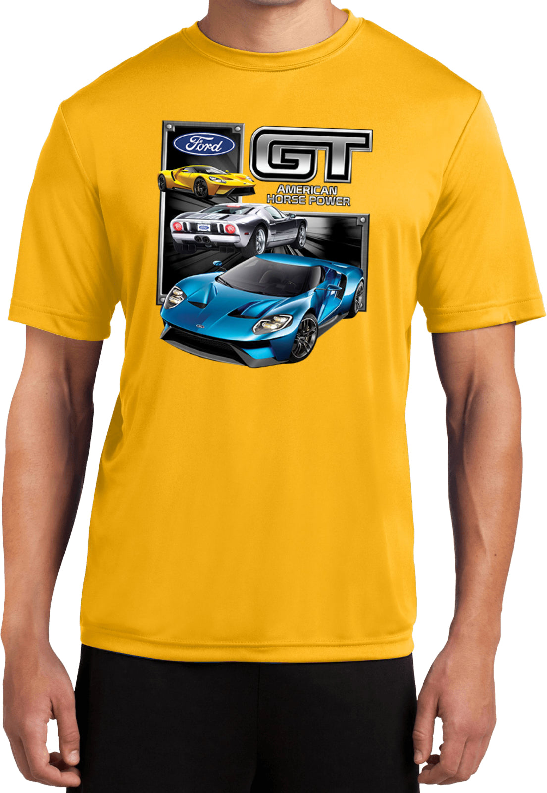 - A lightweight dry wicking t-shirt featuring a collage of the Ford GT Supercar
