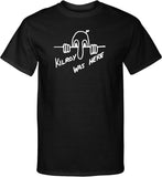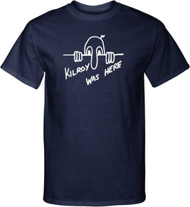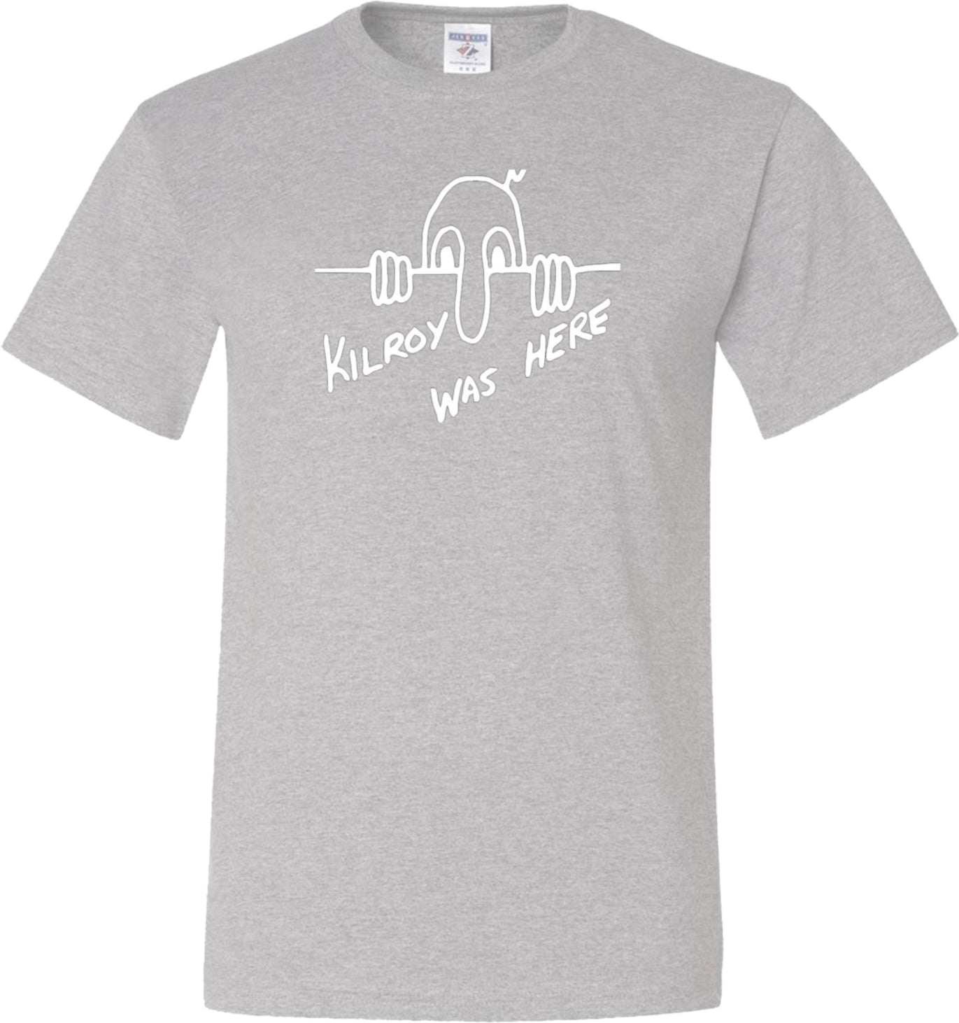 - A tall t-shirt featuring the popular phrase, Kilroy was Here with an illustration of a man peeking over the top of a wall