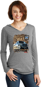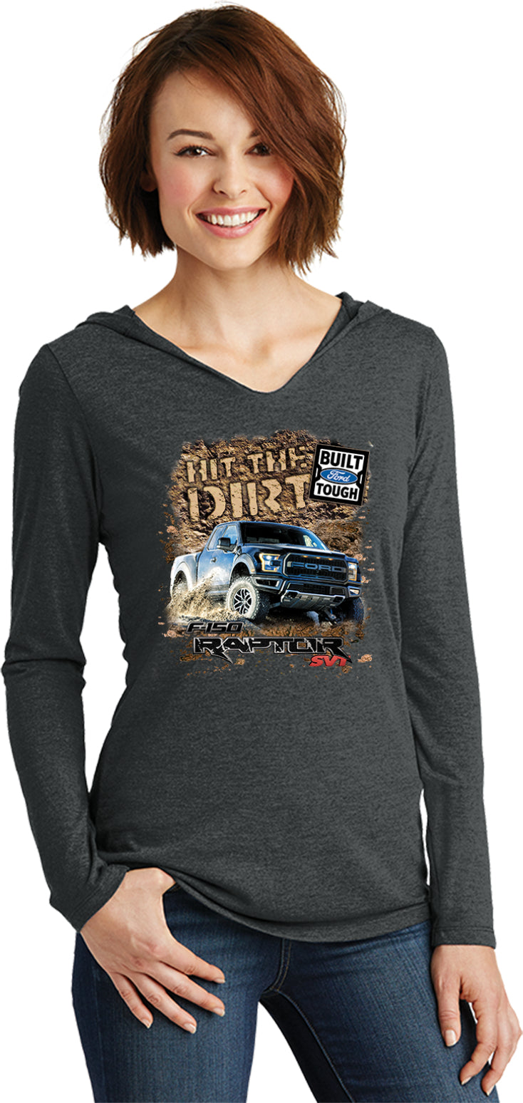 - A ladies lightweight v-neck hoodie featuring an off road Ford F-150 Raptor with the saying Hit The Dirt and a Built Ford Tough logo in the corner