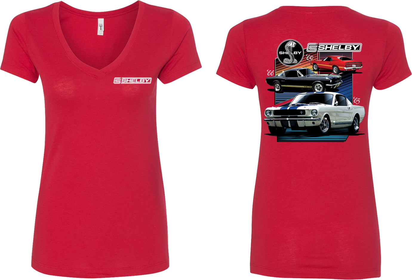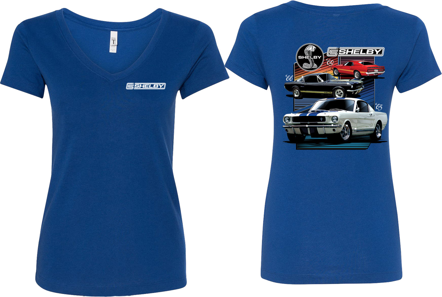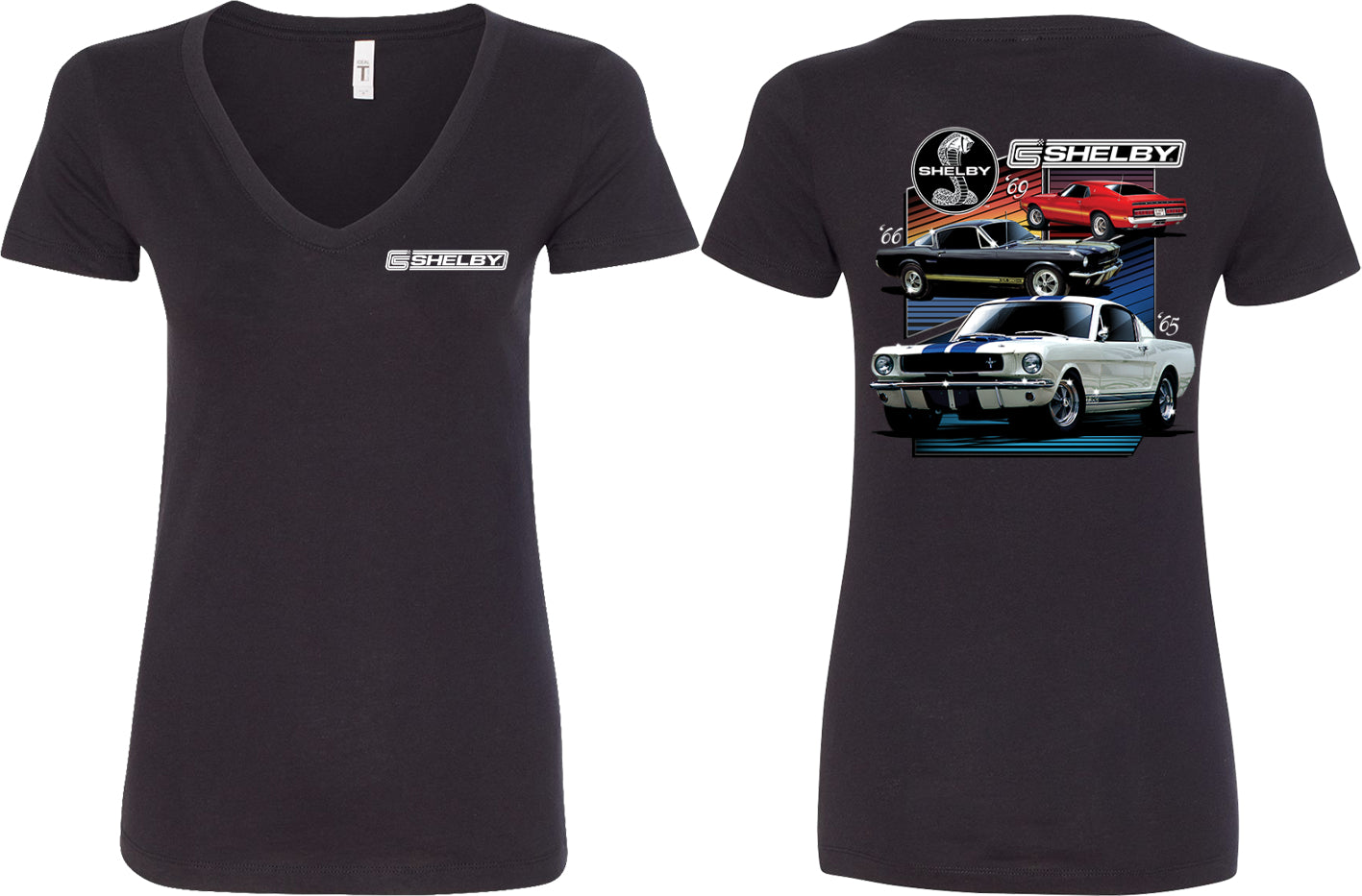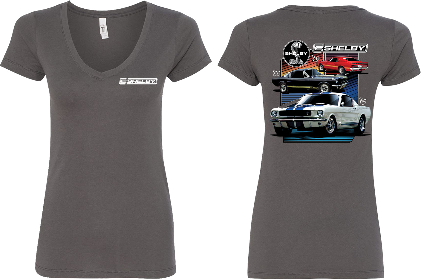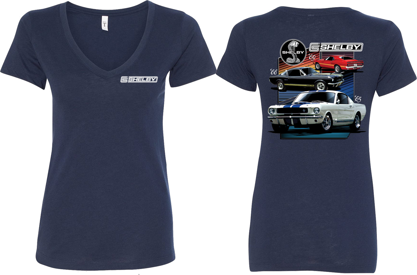 - A ladies v-neck shirt featuring the Mustang Shelby emblem on the front and a collection of Shelbys on the back