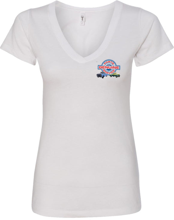 - A ladies v-neck shirt featuring two classic Ford pickups: Genuine Parts Service