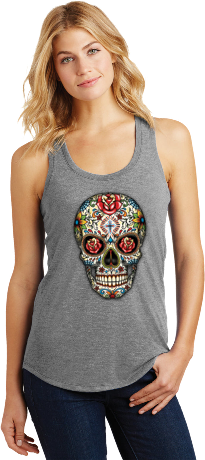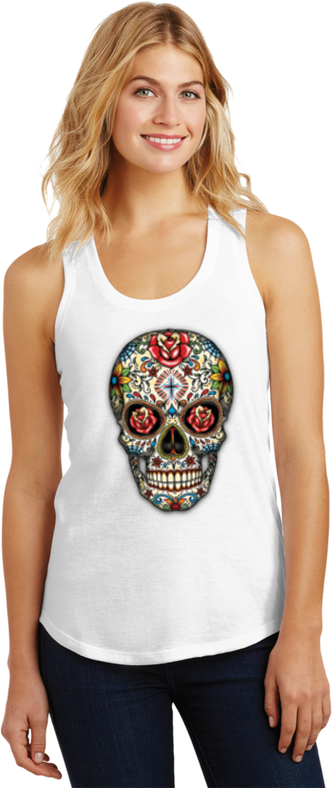 Ladies Halloween Tank Top Sugar Skull with Roses Racerback